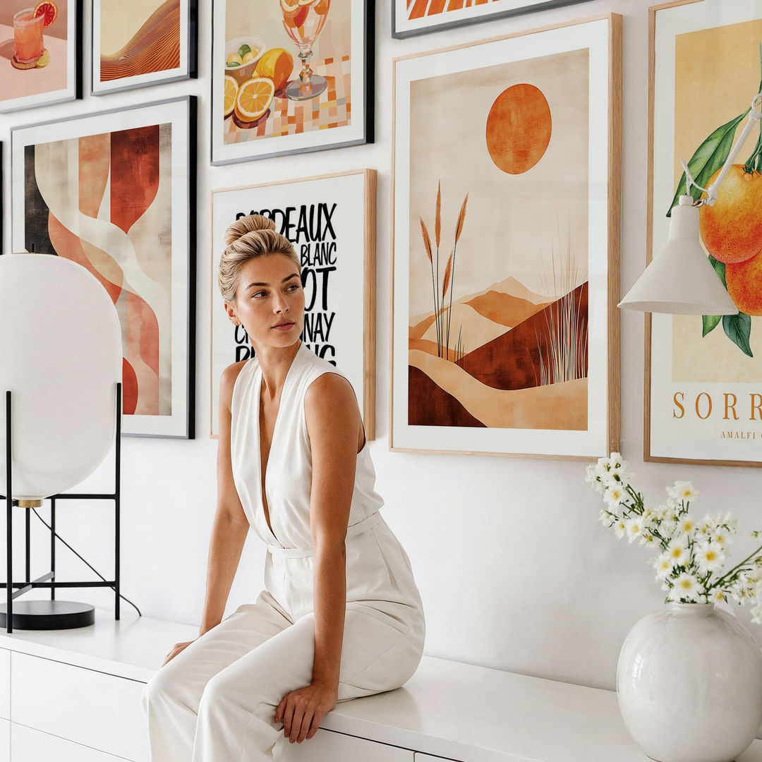 De wanddecoratie straalt rust en evenwicht uit met zijn aardse tinten en organische elementen. De warme oranje en beige tinten worden gecombineerd met zachte rondingen en door de natuur geïnspireerde motieven, waardoor een uniforme en vredige sfeer ontstaat. Elke poster vult de andere aan met zijn eigen unieke charme en transformeert de kamer in een elegante en uitnodigende oase.