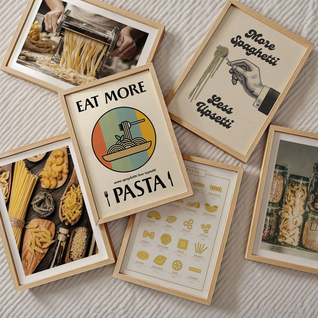 Deze wanddecoratie bruist van de culinaire vreugde van pasta, waarbij elk schilderij bijdraagt aan een harmonieuze viering van de schoonheid van de kookkunst. Met een palet aan warme tinten en een mix van traditionele en speelse motieven creëren deze schilderijen een uitnodigende en smaakvolle sfeer. Perfect om je keuken of eetkamer te transformeren tot een inspirerende plek voor bijeenkomsten en plezier.
