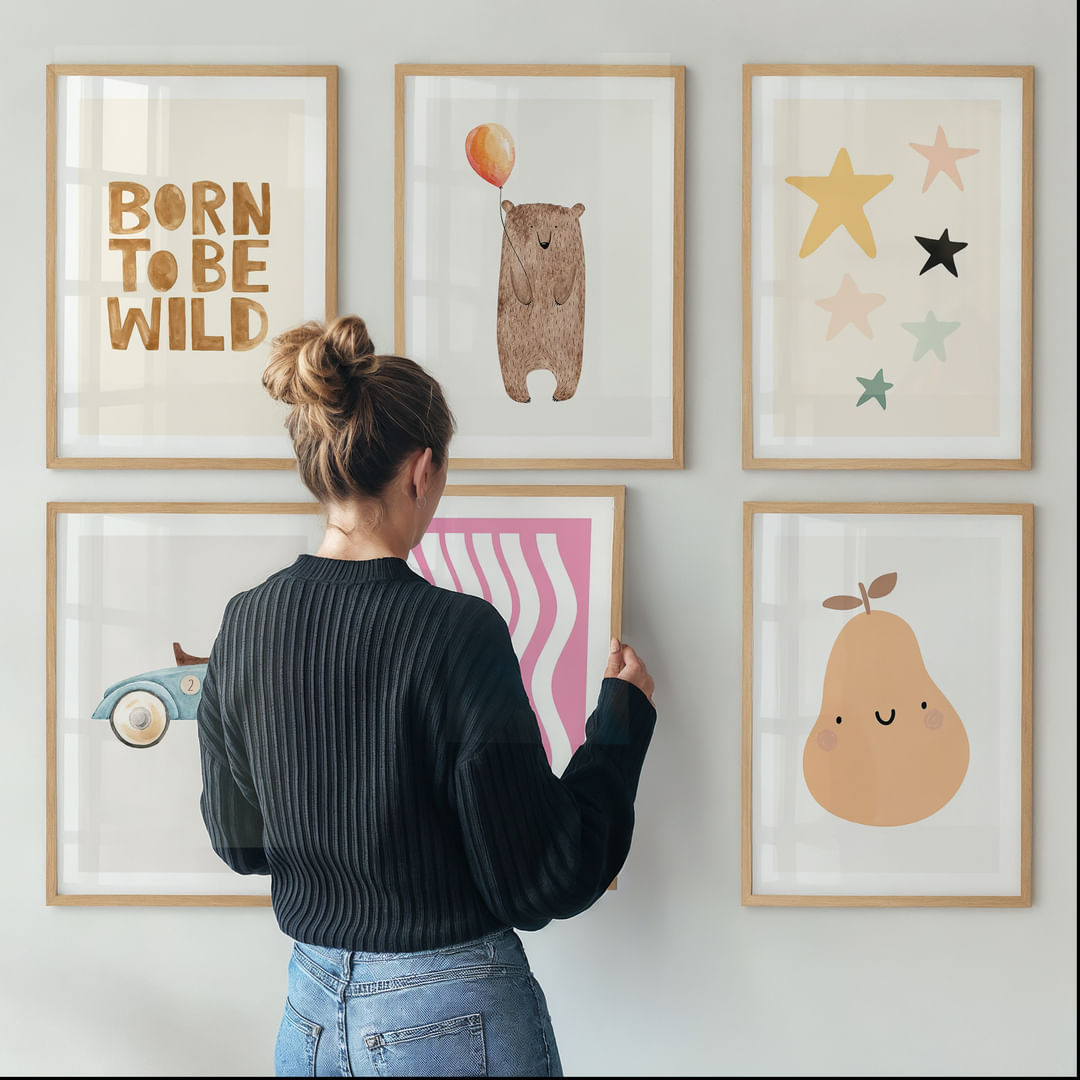De fotowand straalt speelsheid en charme uit met zijn zachte kleuren en fantasierijke motieven, waarbij elke poster bijdraagt aan een gevoel van vreugde en nieuwsgierigheid. De harmonieuze elementen zorgen samen voor een levendige en uitnodigende sfeer in de kinderkamer, perfect om te vernieuwen en op te vrolijken. Een schattige beer samen met een lachende peer zorgt voor vrolijkheid in de kinderkamer.