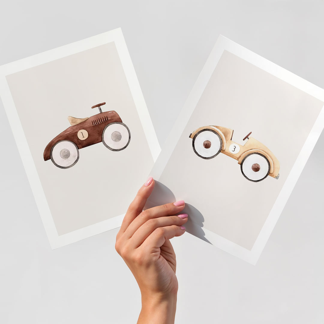 De wanddecoratie straalt een gevoel van tijdloze elegantie uit met afbeeldingen van klassieke voertuigen, waarbij het zachte kleurenpalet in aardse tinten het gevoel van nostalgie versterkt. De balans tussen de motieven creëert een harmonieuze indruk die de kijker meeneemt naar een wereld vol stijl en geschiedenis. Perfect om een kamer tot leven te brengen met een vleugje retro en charme.