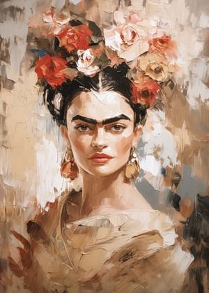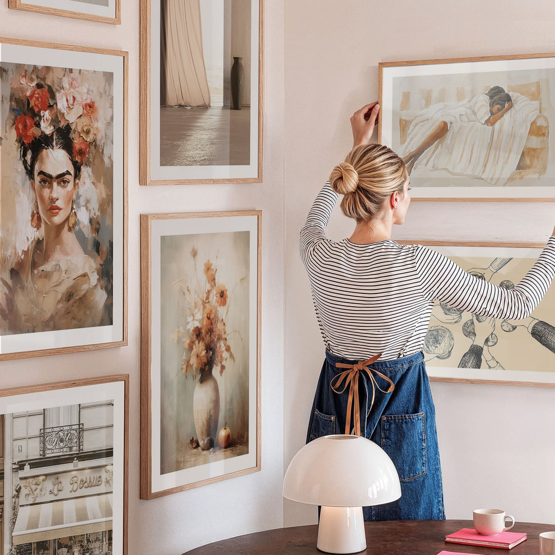 De kunstmuur straalt een zachte elegantie uit door de harmonieus samengestelde posters in warme, aardse kleuren. Frida Kahlo, omringd door bloemen en rustgevende omgevingen, creëert een gevoel van stille poëzie. De subtiele combinatie van kunst met beige en roestrode tinten geeft de kamer een tijdloze schoonheid en charme. Perfect om elke woonkamer te transformeren tot een oase van rust.