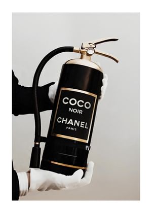 Dit wandkunstwerk trekt de aandacht met een mix van een Prada-hond en een brandblusser van Coco Chanel. De contrasterende thema's en kleuren van deze posters creëren een harmonieuze balans tussen moderniteit en klassieke elegantie. Warme tinten complementeren het monochrome palet en geven een verfijnde uitstraling die elke kamer subtiel verfijnt met elegantie en stijl.