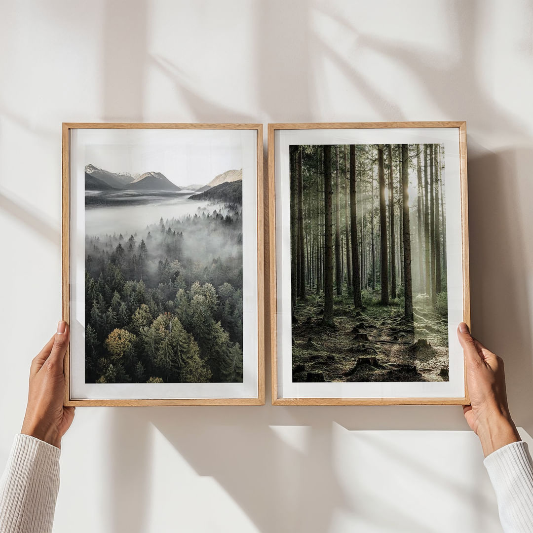 Deze twee posters vangen de tijdloze schoonheid van de bossen en geven een gevoel van rust en verwondering. De mistige ochtend omarmt de bergen en bomen in een mystieke omhelzing, terwijl zonnestralen zachtjes door het dichte bos filteren. Elke poster is een poort naar de vrede en harmonie van de natuur. Samen creëren ze een inspirerende sfeer en transformeren ze je ruimte tot een oase van rust en natuurlijke verwondering.