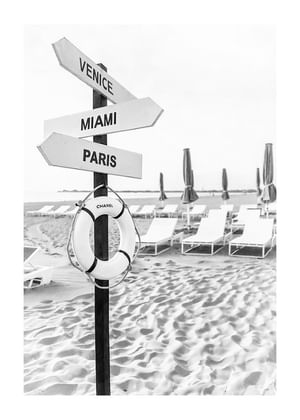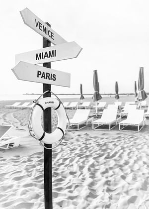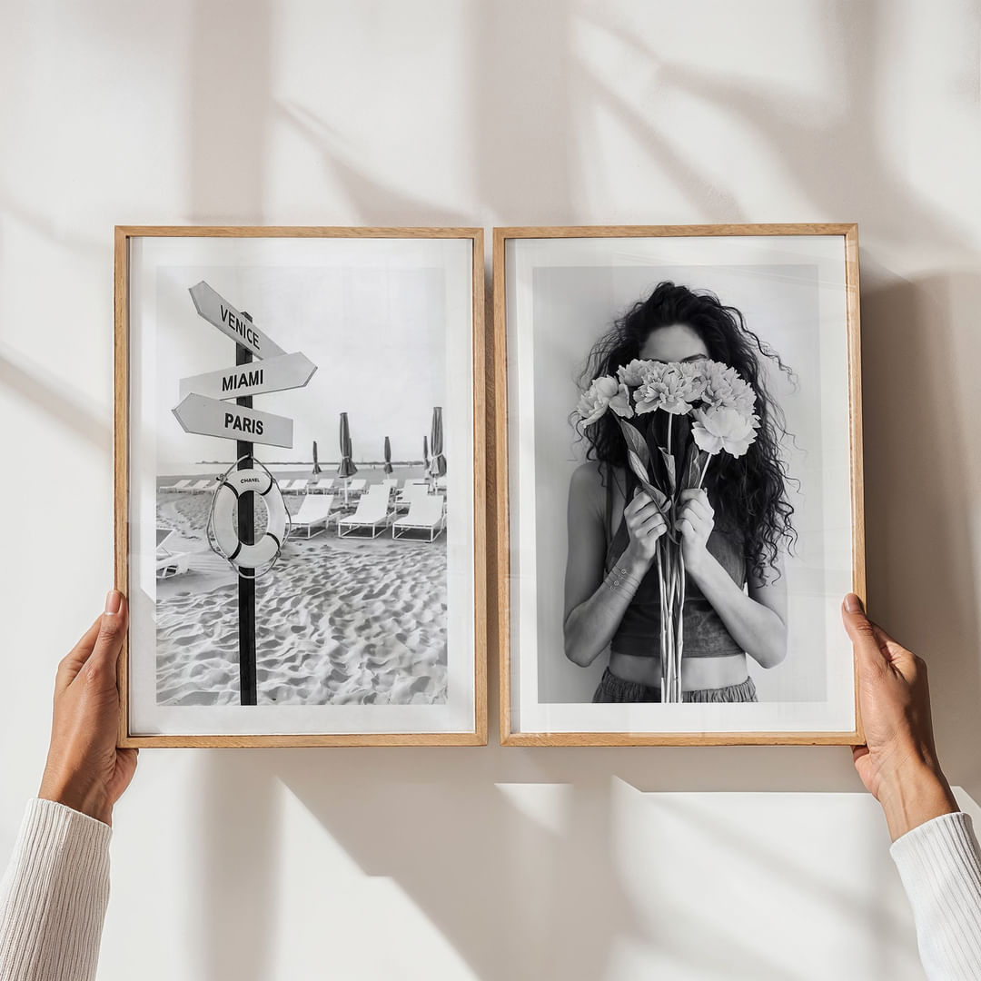 Deze Coco Chanel-posters met naadloos patroon creëren een gevoel van dualiteit en een stijlvolle esthetiek. Op een van de afbeeldingen is een vrouw te zien die haar gezicht gedeeltelijk bedekt met bloemen en een Coco Chanel-armband draagt, terwijl op de andere een strand is afgebeeld met borden die naar iconische steden verwijzen. Deze posters stralen subtiele elegantie uit en voegen een vleugje internationale charme en tijdloosheid toe aan elke kamer.