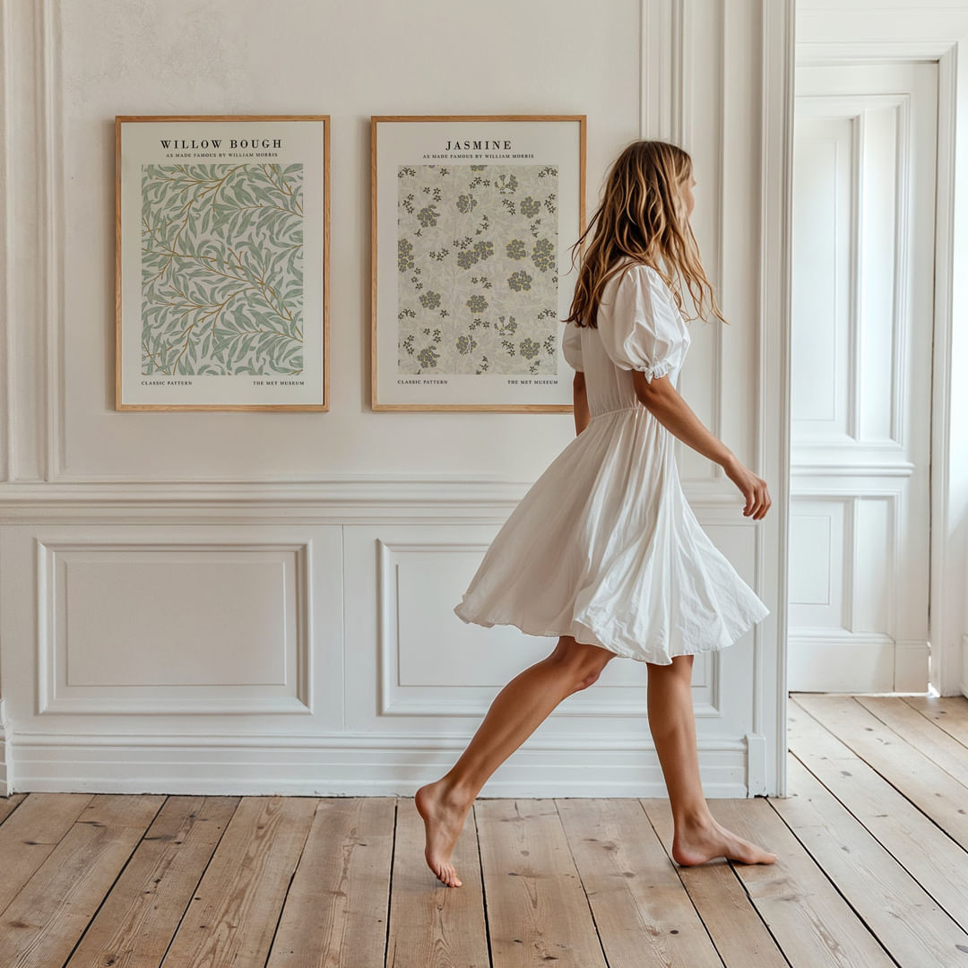 Deze posters van William Morris vormen een levende symfonie van subtiele patronen uit de natuur, waarbij elke poster een lichte en luchtige sfeer uitstraalt. De kleuren ademen lente en creëren een harmonieuze en evenwichtige sfeer die de kamer opfleurt. Het ontwerp van de kunstwand vult de ruimte met een gevoel van elegantie en verfijning dat elk interieur naar een nieuw niveau van esthetisch genot tilt.