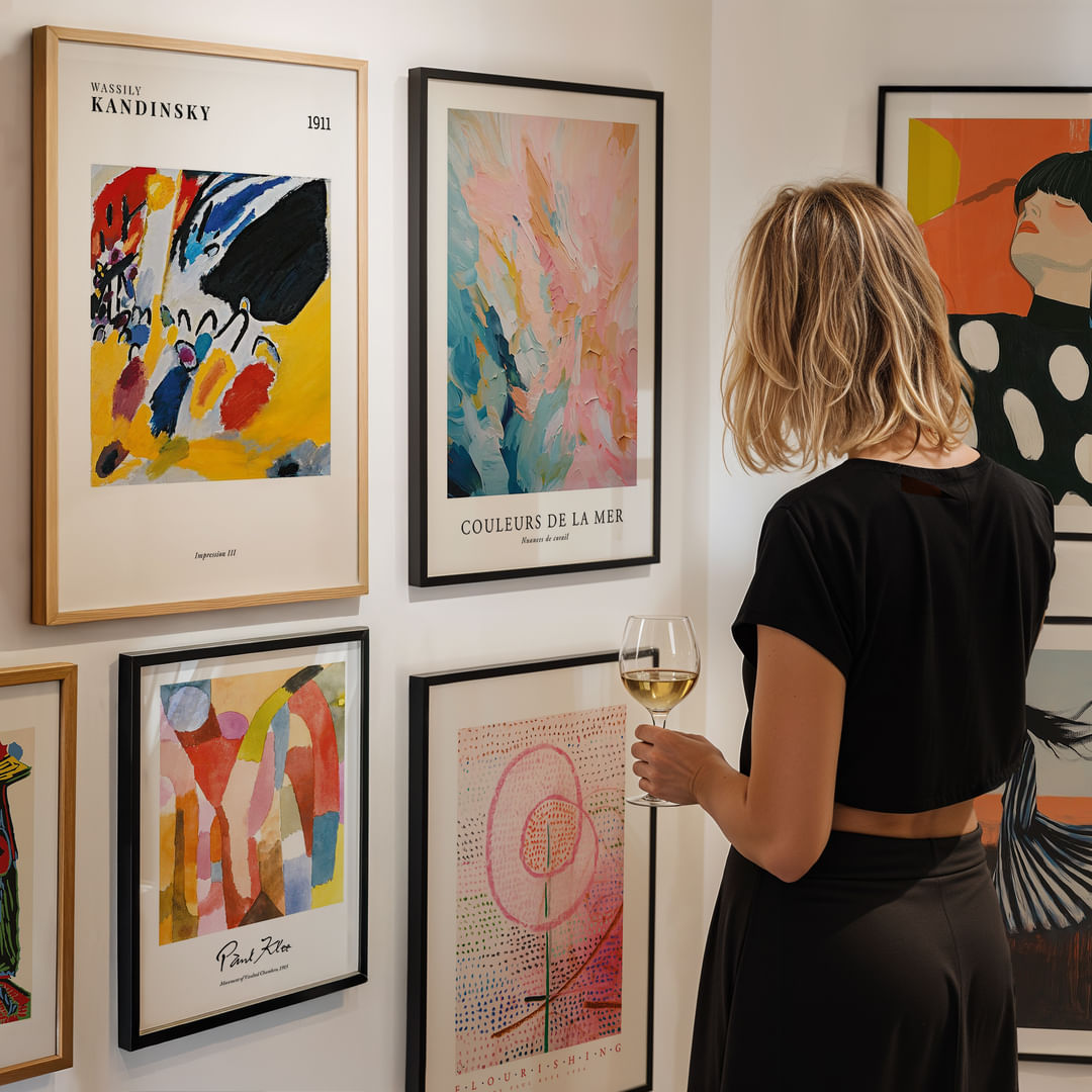 Deze kunstmuur betovert met zijn kleurrijke en gevarieerde posters die een artistieke stroom van emoties en stijl creëren. Kleuren en vormen van Paul Klee en Wassily Kandinsky werken samen om een visuele reis te creëren die zowel dynamisch als harmonieus is. Hier worden abstracte en moderne elementen verenigd in een balans die elk interieur verrijkt en naar een hoger niveau tilt.