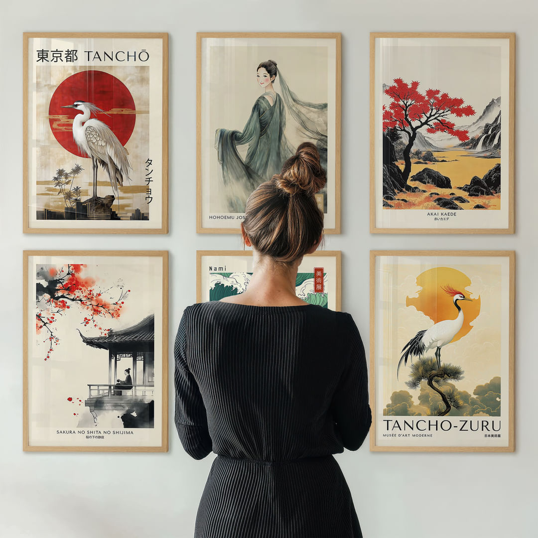 Deze posters ademen een gevoel van Japanse elegantie, waarbij de verschillende motieven en kleurnuances van elk schilderij perfect in balans zijn. De gedempte rood- en grijstinten creëren een verfijnd contrast, terwijl motieven uit de traditionele Japanse kunst een nostalgisch gevoel oproepen. Deze artistiek samengestelde Japandi-collectie transformeert de kamer in een oase van rust en biedt een stijlvolle toets Aziatische esthetiek.