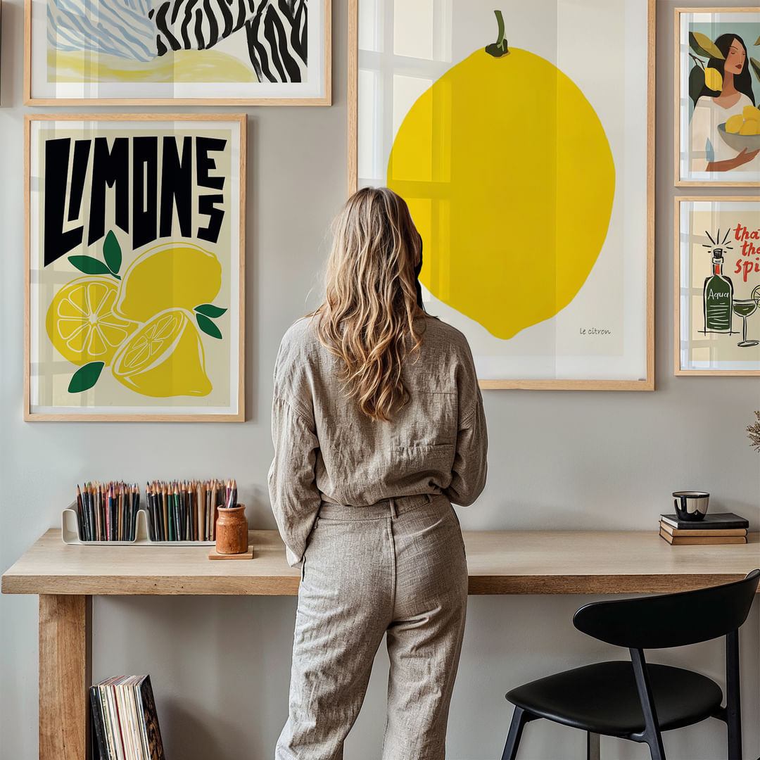 Deze posters stralen een levendige energie uit, waarbij intense geeltinten en gedurfde grafische elementen een harmonieuze balans creëren. De prominente citroen trekt de aandacht en wordt aangevuld door een palet dat zowel elegantie als speelsheid uitstraalt. Hier verenigen de kleur en vorm van de kunstwerken zich tot een samenhangend geheel dat de kamer verfraait met zijn frisheid en stijlvolle uitstraling.