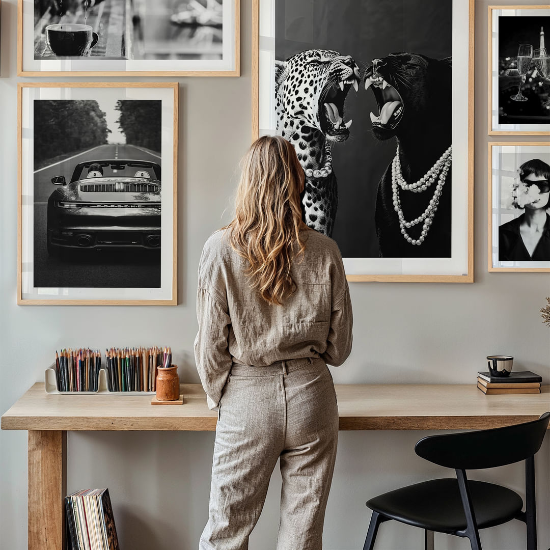 Deze wanddecoratie straalt kracht en elegantie uit door het zwart-witthema en het contrast tussen beweging en stilte. De verschillende motieven van deze posters werken ritmisch samen, waarbij elke poster zijn eigen dynamiek toevoegt en een verfijnde en moderne sfeer creëert. Het geheel geeft een gevoel van urban chic en tilt de kamer op met zijn stijlvolle en doordachte uitstraling.