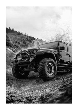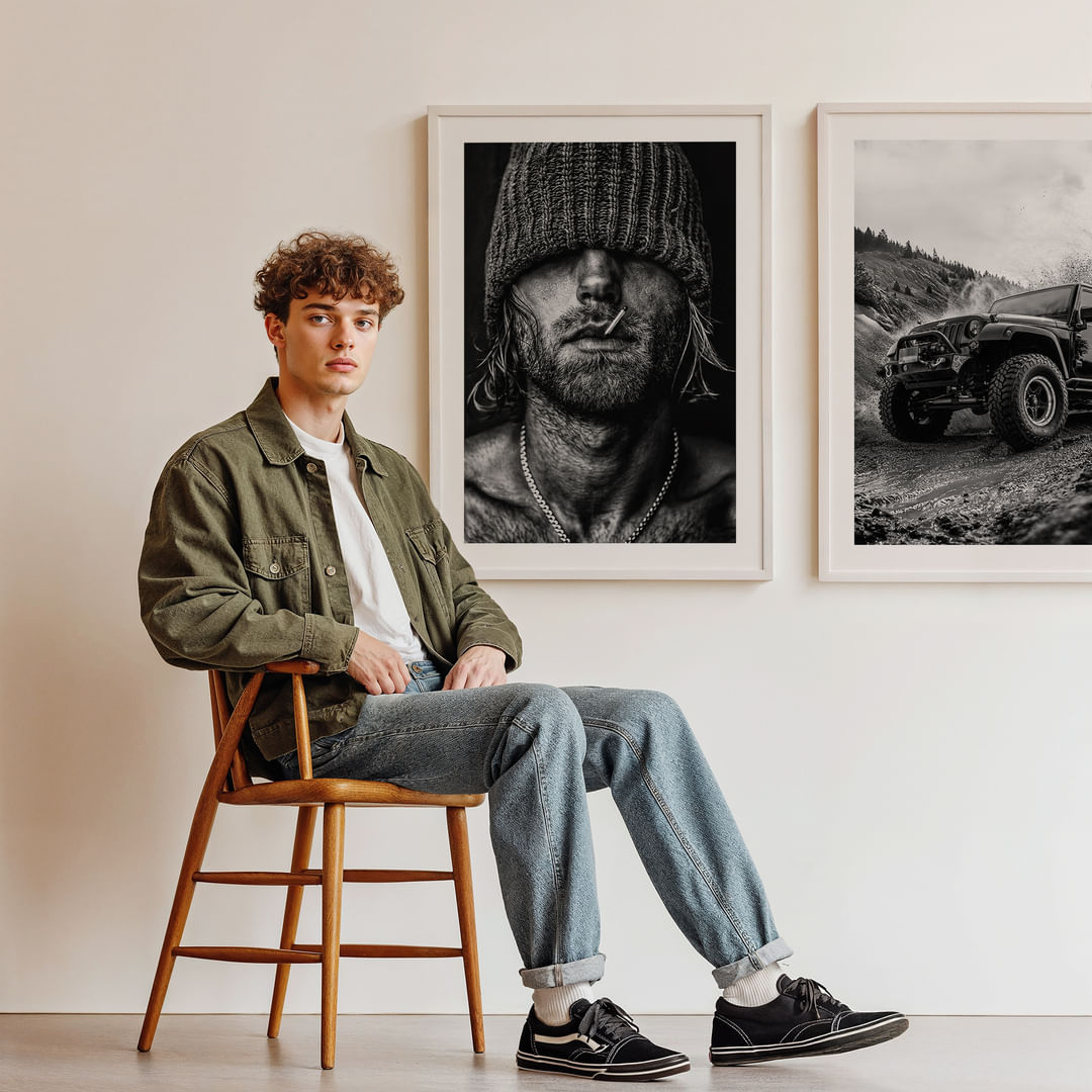 De schilderijenwand wekt een krachtige indruk met zijn gedempte kleuren en onderzoekende motieven. Deze posters balanceren tussen rust en wildernis, waar een jeep door de modder rijdt en een portret van een rebel met een pet over zijn ogen tegenkomt, wat de kamer kracht geeft. De diepe textuur en tinten trekken de aandacht en nodigen uit tot reflectie. Perfect voor wie zijn huis een modern maar tijdloos karakter wil geven.