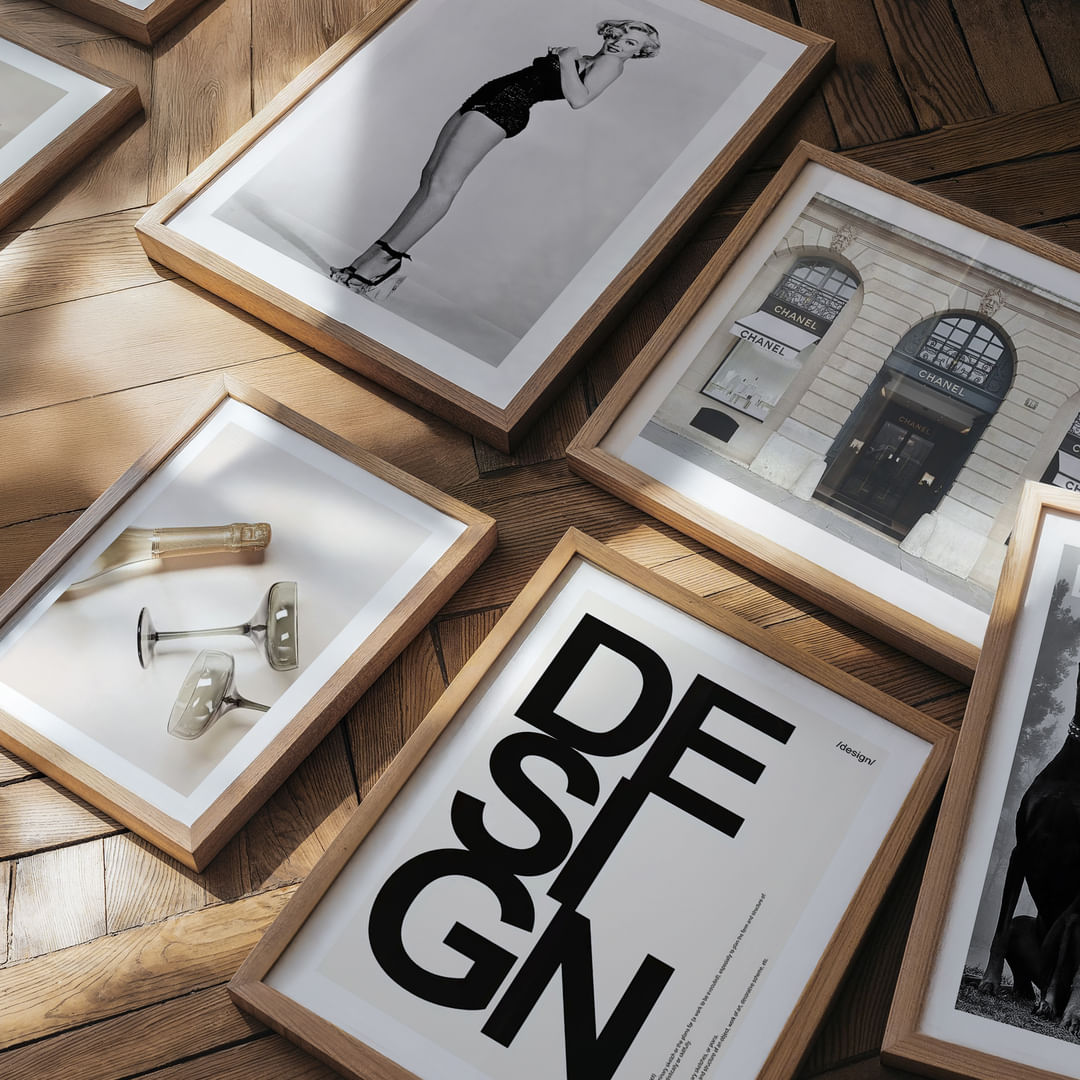 De kunstmuur straalt een gevoel van verfijnde stijl uit, waarbij elke poster bijdraagt aan een samenhangende esthetische ervaring. De zwart-witte Marilyn Monroe-poster, samen met mode van Chanel en Balenciaga, combineert modebewustzijn met klassiek design, terwijl de verschillende texturen en thema's van de motieven een dynamische diversiteit creëren. Perfect als artistiek middelpunt dat de kamer verrijkt met zijn elegantie en eigentijdse charme.