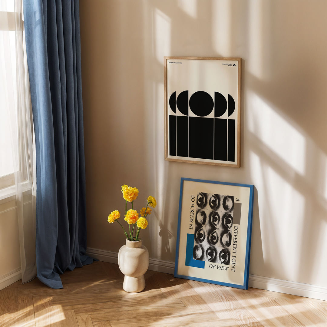Deze kunstwand fascineert met zijn elegante grafische vormen en gedurfde contrasten, waarbij de zwarte poster met geometrische motieven verweven is met de blauwachtige poster die de perspectieven en dimensies van een groep ogen verkent. Samen creëren ze een visueel gesprek dat de kijker naar binnen trekt en de ruimte een moderne en verfijnde sfeer geeft.