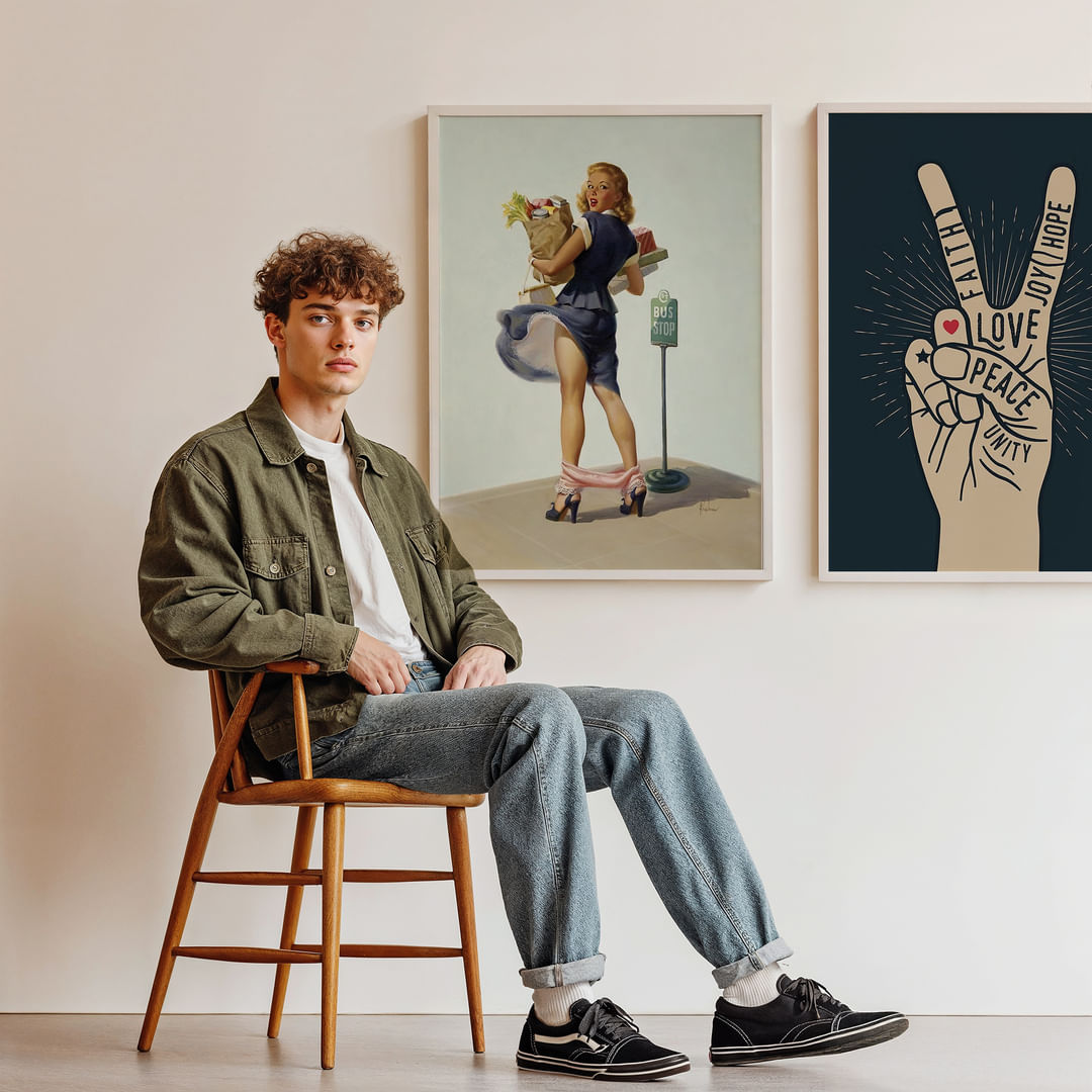 Dit wandkunstwerk combineert een fascinerende balans tussen retro charme en modern minimalisme. Deze expressieve posters met gestileerde figuren en symboliek brengen leven en beweging, terwijl het harmonieuze kleurenpalet een uitnodigende sfeer creëert. Samen benadrukken deze posters een verfijnde vintage stijl die elke kamer transformeert tot een elegante en tot nadenken stemmende oase.