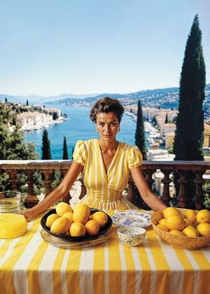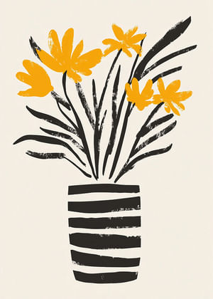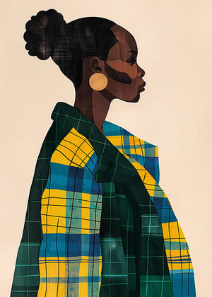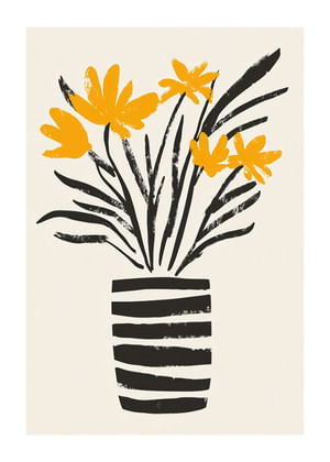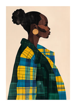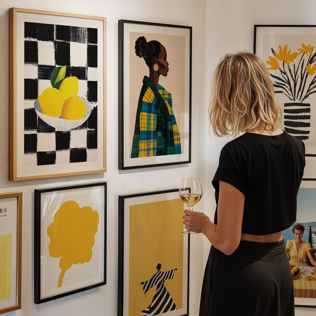 De wanddecoratie creëert een visuele symfonie waarin gedurfde patronen en zachte tinten samenkomen. Een centrale figuur, gekleed in een ruitmotief, vormt een blikvanger die de intens gele citroenen en bloemen uit de collectie verenigt. De verschillende expressies van deze posters vullen elkaar aan en benadrukken een gevoel van samenhang en stijl. Deze posters geven elk interieur een verfijnde en levendige sfeer.