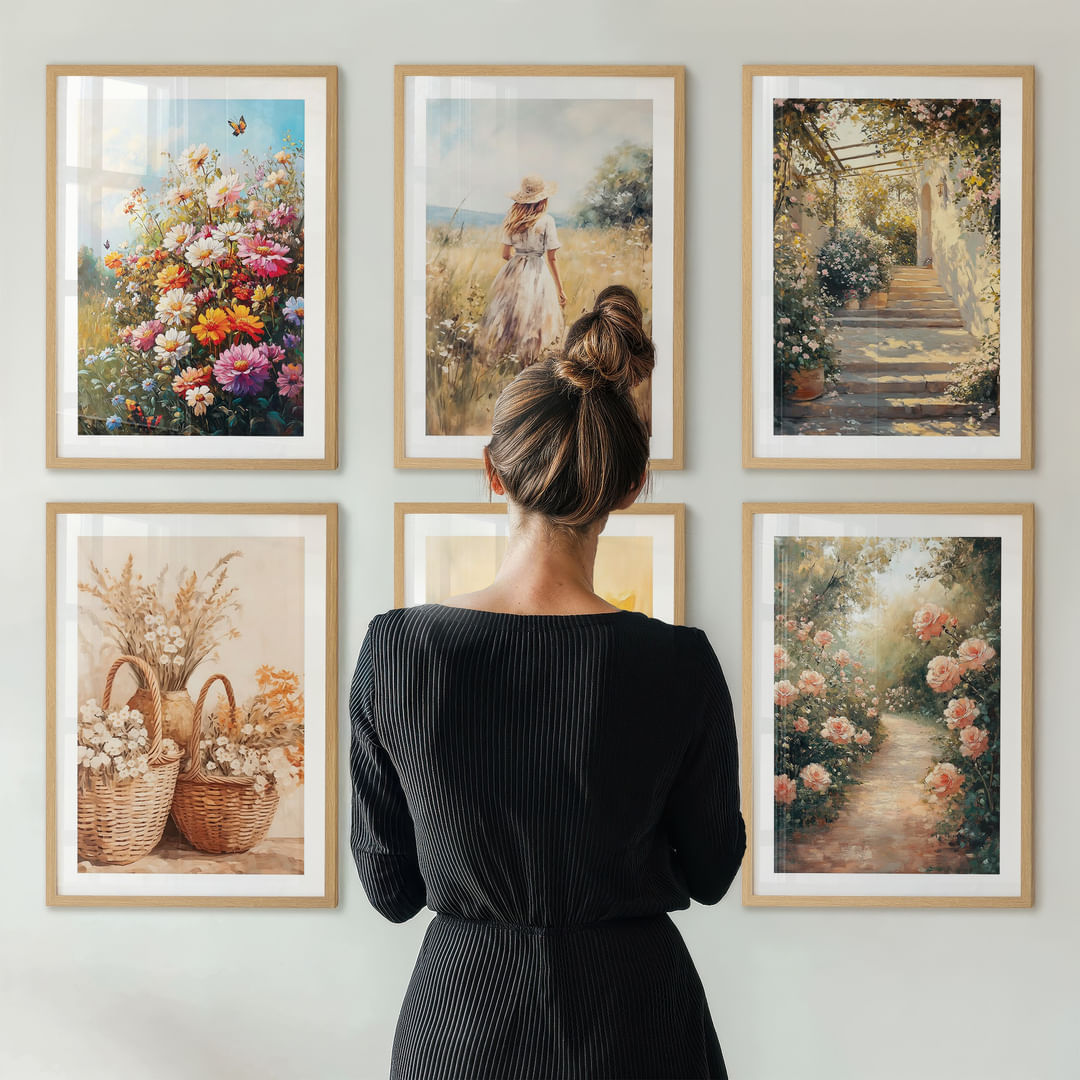 Deze betoverende wanddecoratie combineert harmonieuze afbeeldingen van bloeiende tuinen en nostalgische landschappen en creëert zo een dromerige sfeer en een kleurenpalet dat elke leefruimte zal verfraaien. De zachte tinten en verweven motieven van deze posters nodigen uit tot rust en een gevoel van vluchtige zomerherinneringen, perfect in balans om de kamer een uniek karakter en stijl te geven.