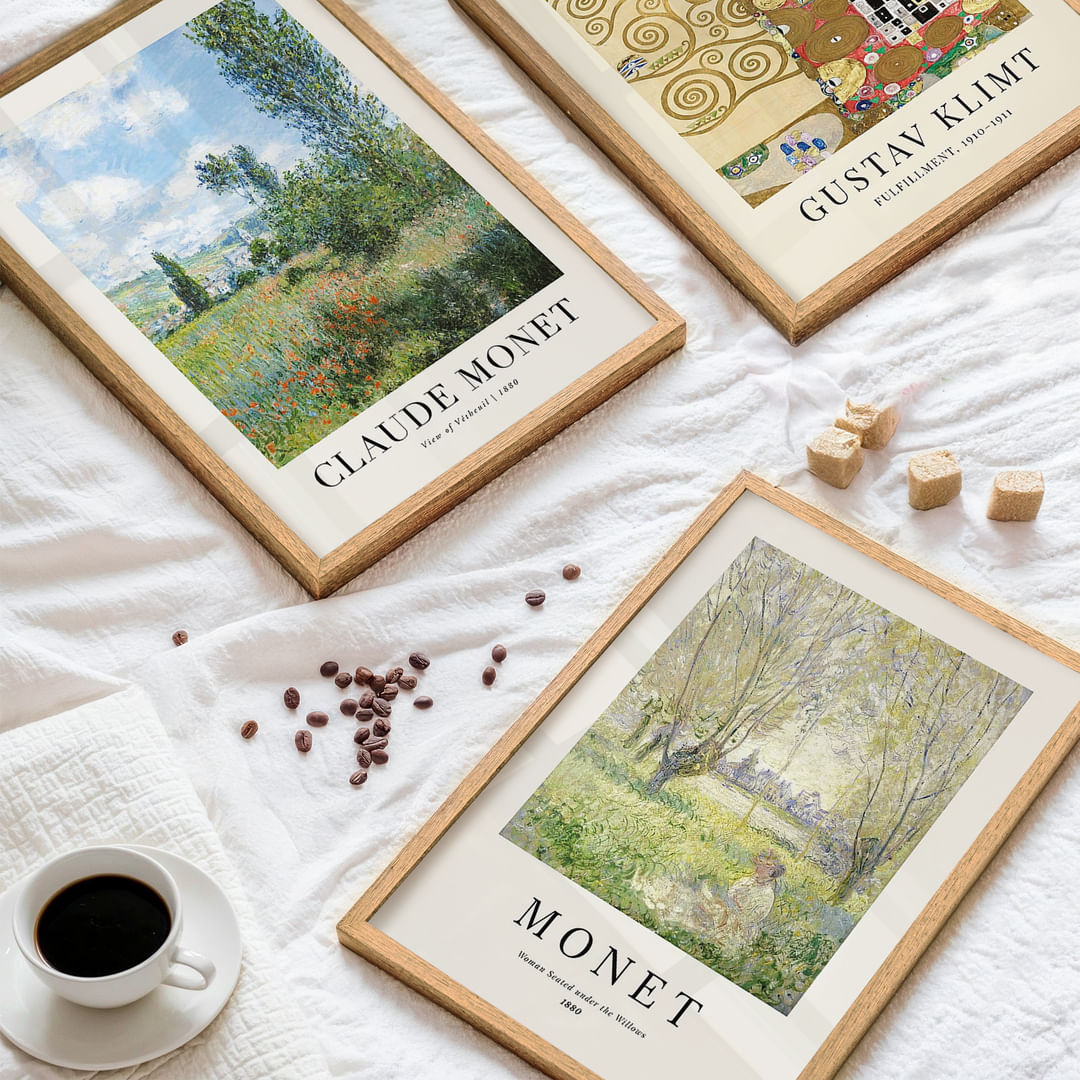 Deze kunstmuur straalt een tijdloos gevoel van rust en inspiratie uit door middel van impressionistische posters met motieven van Claude Monet en Gustav Klimt die de schoonheid van de natuur weerspiegelen. De zachte penseelstreken en heldere kleurenpaletten van de schilderijen creëren een kalmerende dialoog tussen de kunst en de ruimte, waardoor de sfeer wordt versterkt met een gevoel van verfijnde elegantie en culturele immersie.