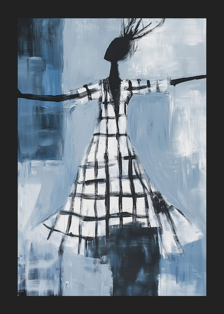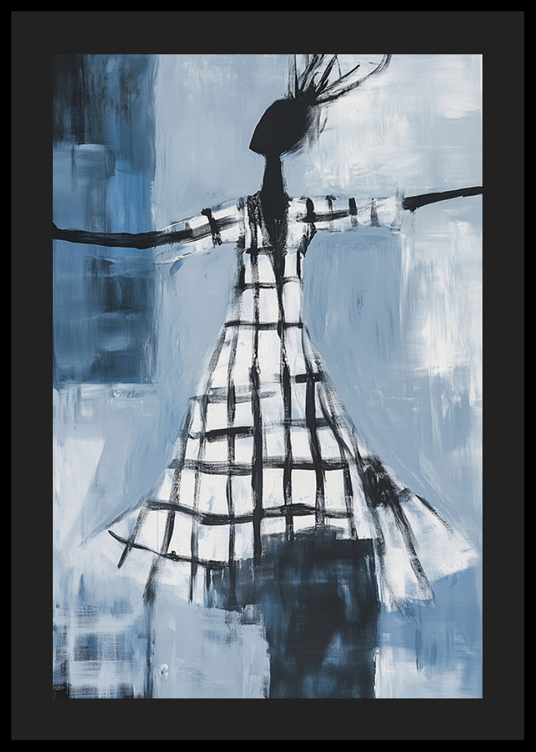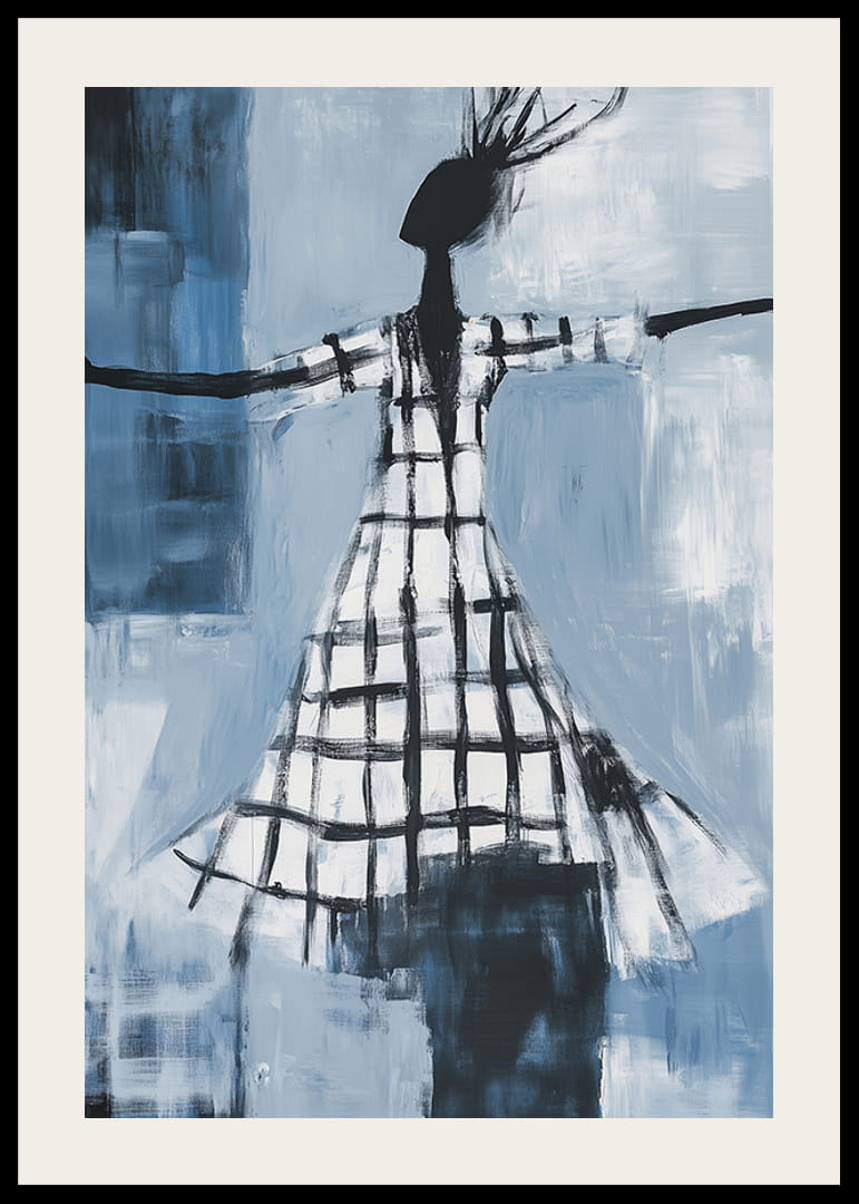 Deze poster legt het moment van een vrije dans vast, waarbij vloeiende lijnen en diepblauwe tinten een gevoel van vrijheid en beweging creëren. De figuren in zwart-wit contrasteren met de achtergrond en creëren een gevoel van mysterie en elegantie.