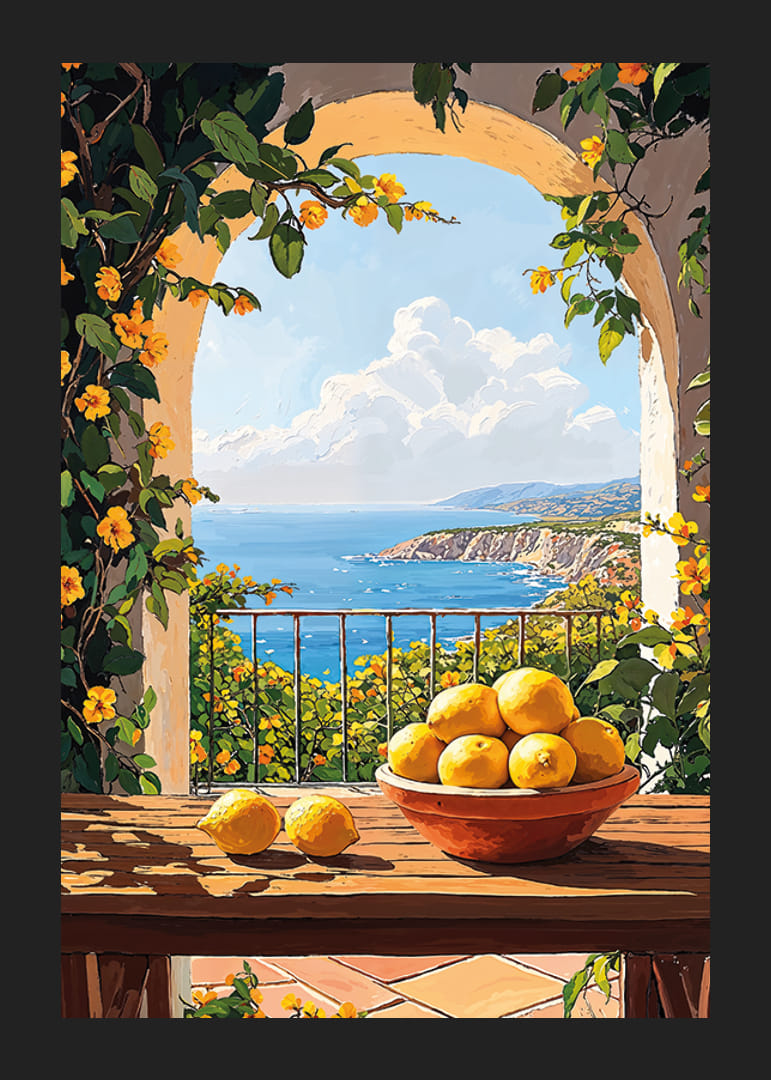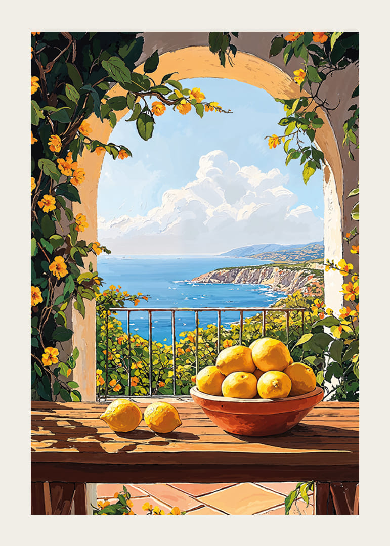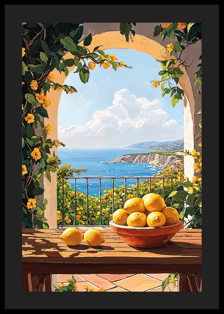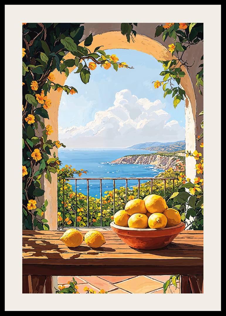 Leg de magie van de Middellandse Zee vast met deze poster die warmte en licht uitstraalt. Een zonovergoten terras vol gele bloemen en een schaal vol verse citroenen zorgt voor een perfecte mediterrane sfeer.