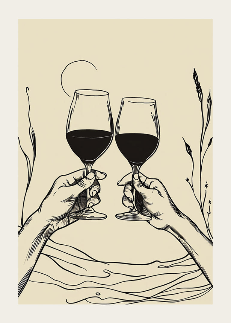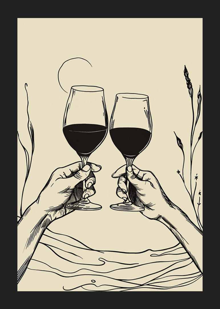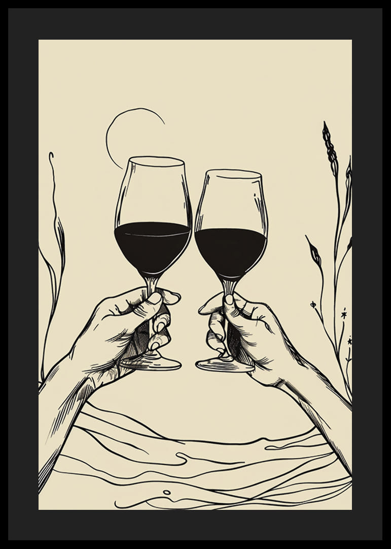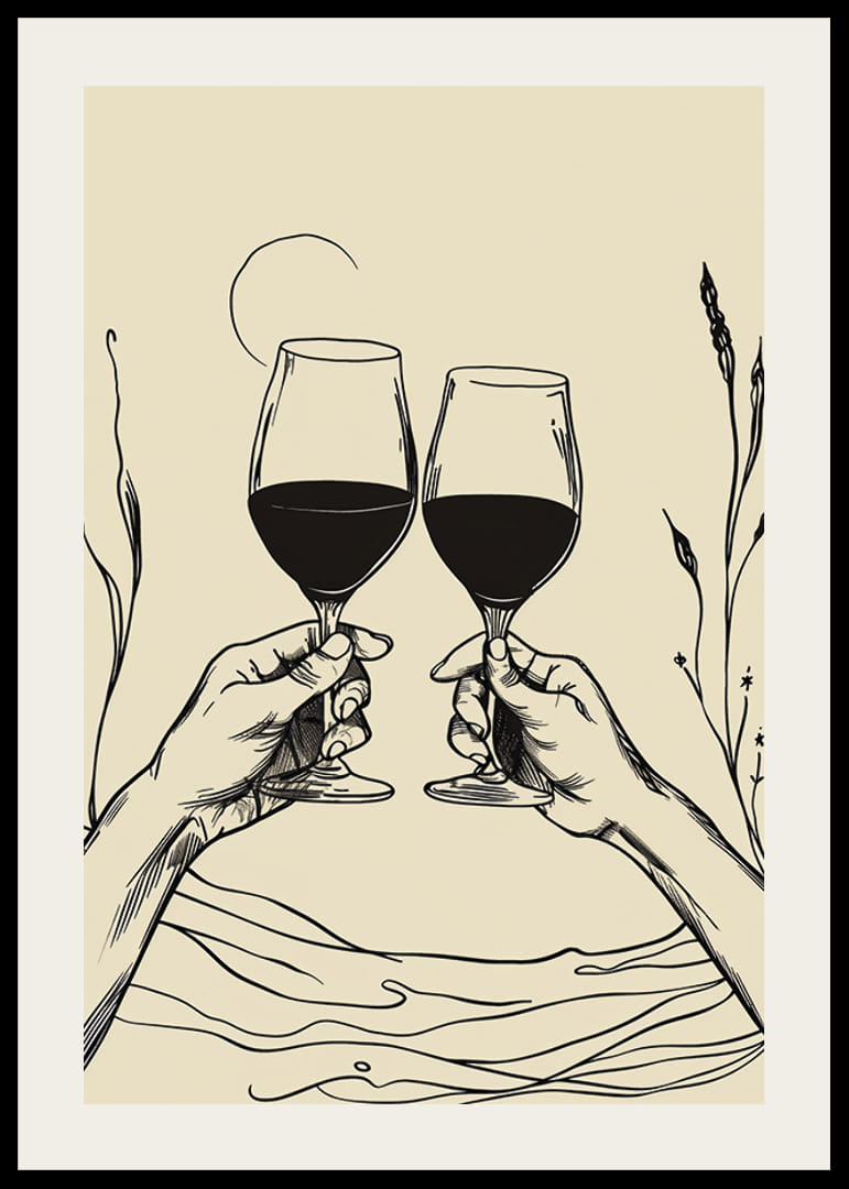 Deze poster legt een elegant moment vast met twee handen die wijnglazen heffen tegen een achtergrond van vloeiende lijnen en subtiele planten. Met zijn minimalistische uitstraling en strakke lijnen straalt het een gevoel van gemeenschap en gedeelde vreugde uit.