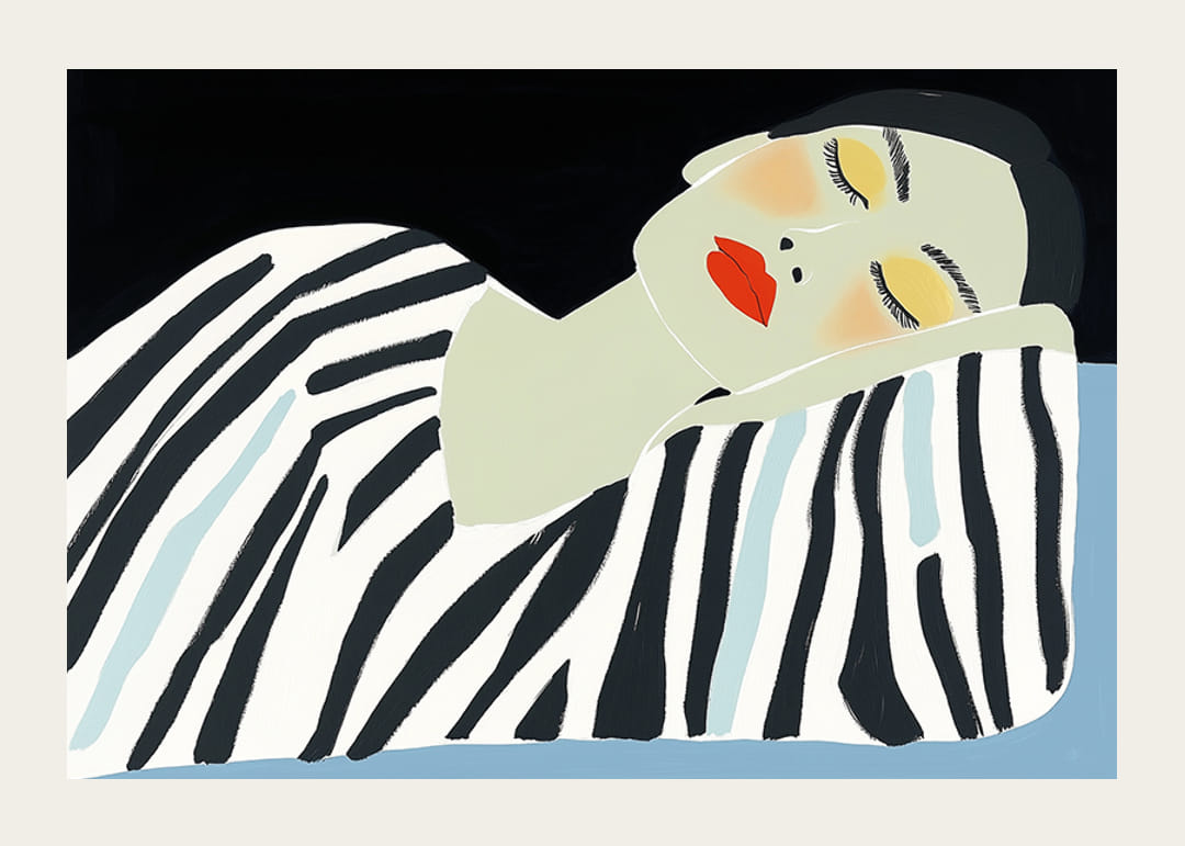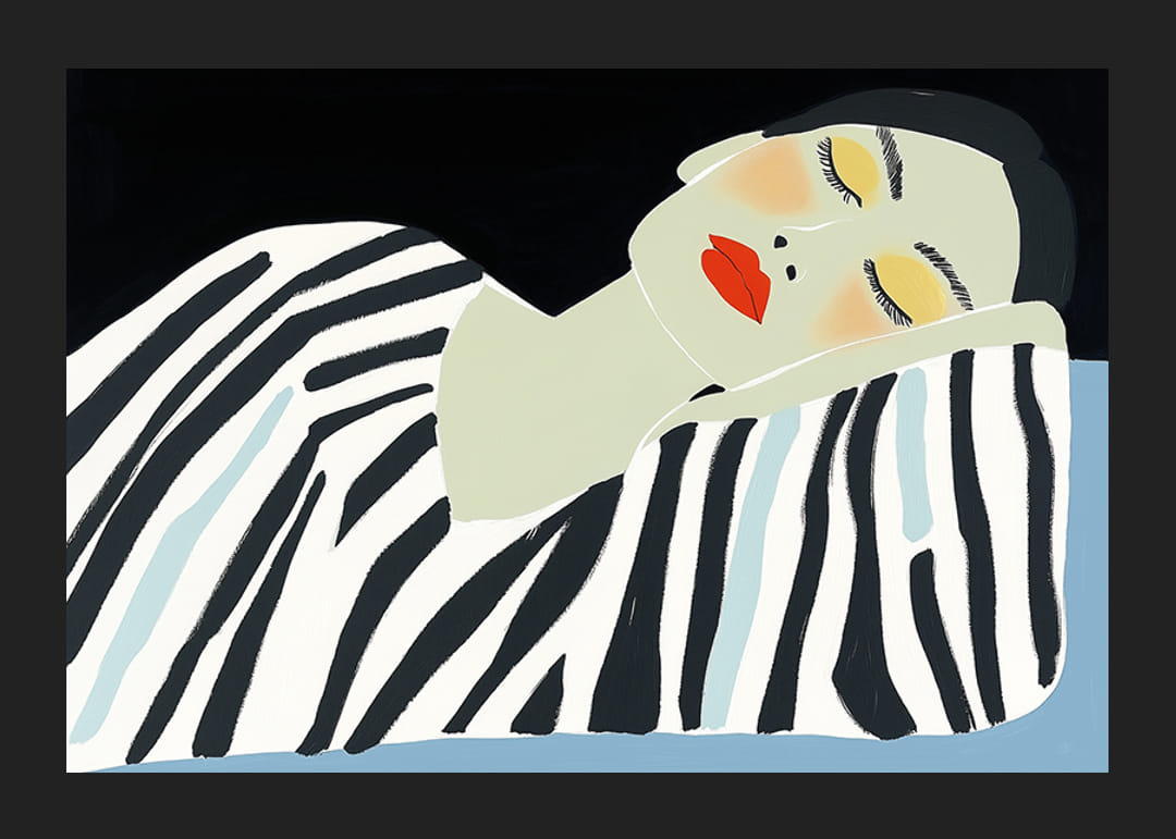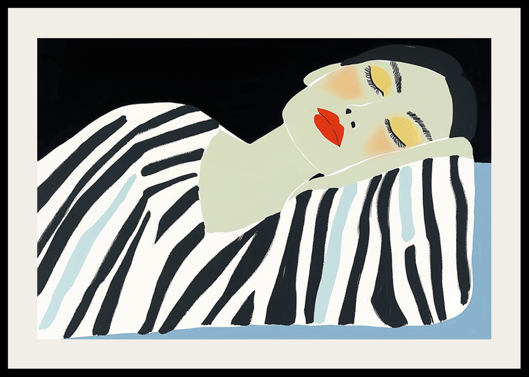 Deze poster legt een stille schoonheid in rust vast, verpakt in zwarte en witte strepen die een gevoel van zowel beweging als kalmte oproepen. De rode lippen contrasteren prachtig met de gedempte tinten om haar heen en creëren een dromerige sfeer.