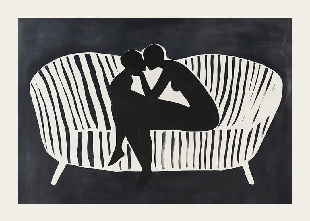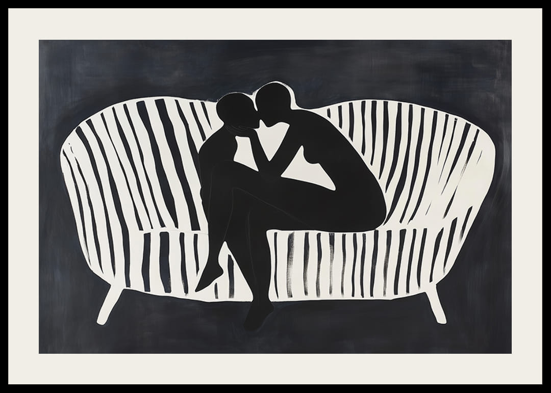 Deze poster legt een moment van stil samenzijn en intimiteit vast, waarbij twee silhouetten elkaar in een liefdevolle omhelzing omarmen op een elegante, witgestreepte bank. Het minimalistische ontwerp en de stijlvolle contrasterende kleuren creëren een rustgevende sfeer.