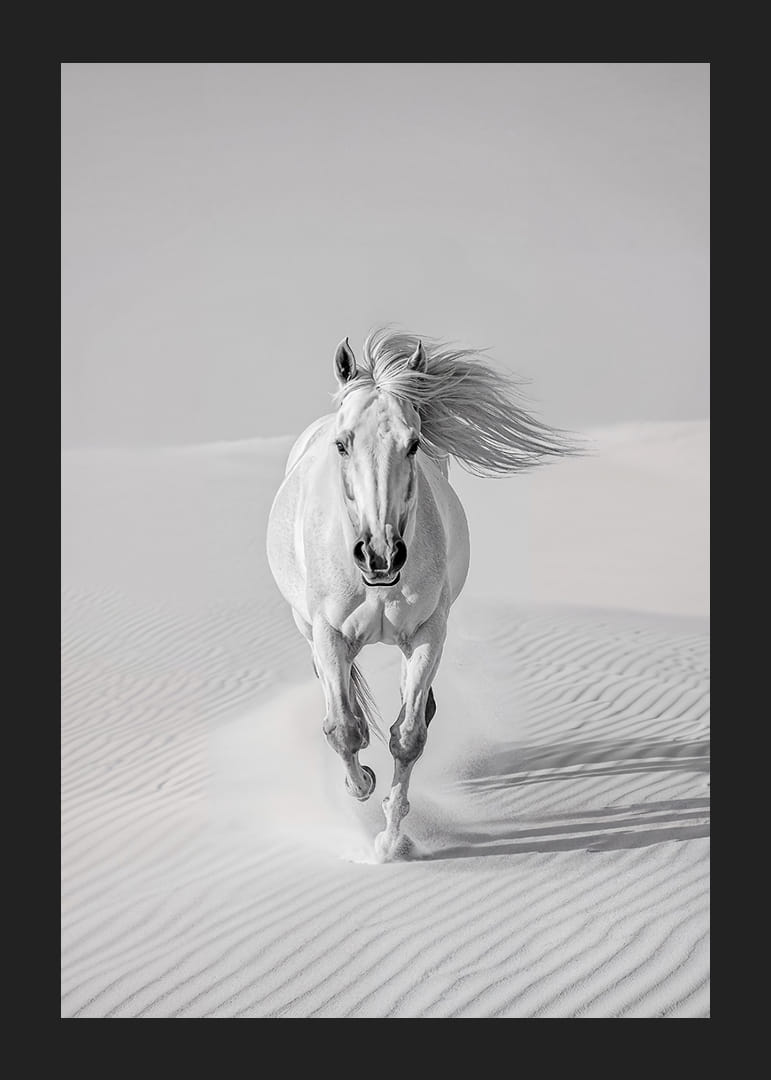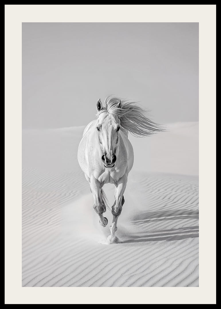Deze poster legt de elegantie vast van een wit paard dat door het woestijnzand galoppeert, met de wind door zijn manen. De combinatie van het lichte zand en de krachtige beweging van het paard creëert een dramatisch gevoel van vrijheid en kracht. De poster zal een prachtig detail aan de muur zijn en de kamer een sfeer van avontuur en oneindigheid geven, perfect om te inspireren en te fascineren.
