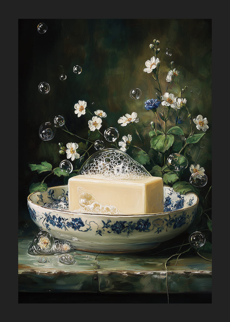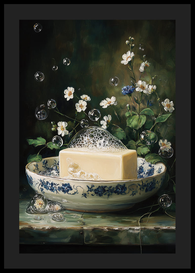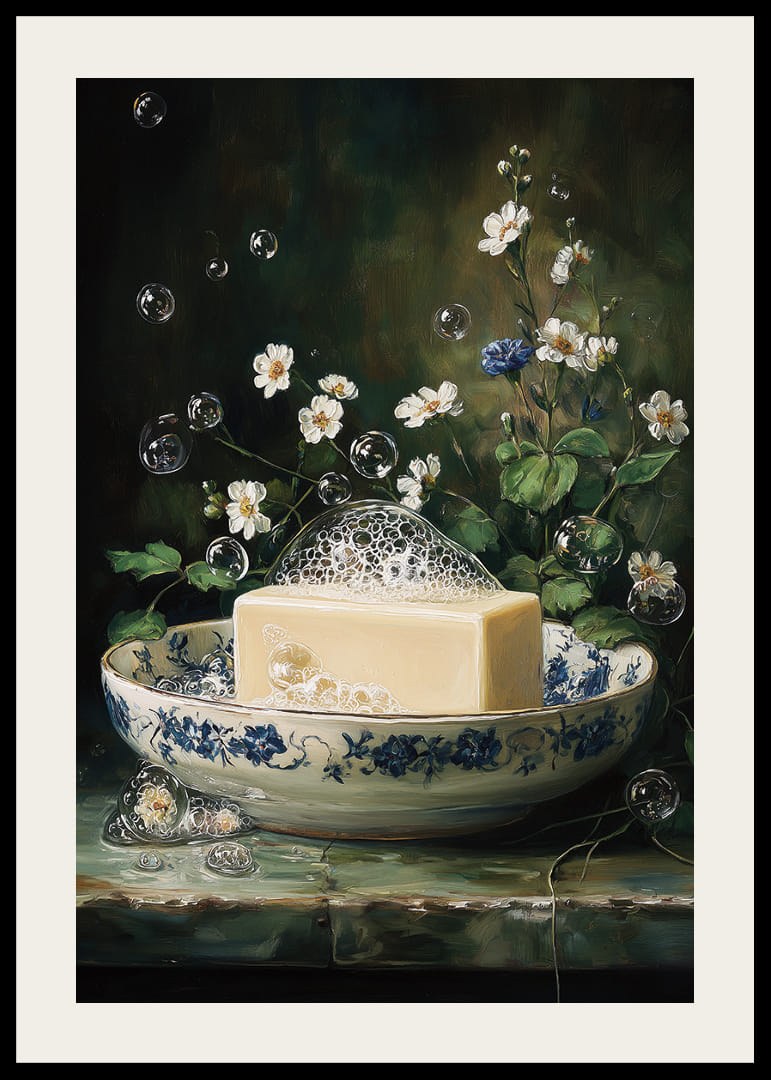 Deze poster toont een betoverende scène: een elegante zeepkrans met schuimende bubbels, omringd door witte bloemen in volle bloei. Het blauw-witte porselein versterkt de schoonheid en geeft een gevoel van tijdloze elegantie. De bubbels zweven speels door de lucht en creëren een dromerige sfeer. Plaats deze poster in je huis om het dagelijks leven op te fleuren met een gevoel van rust en artistieke charme.