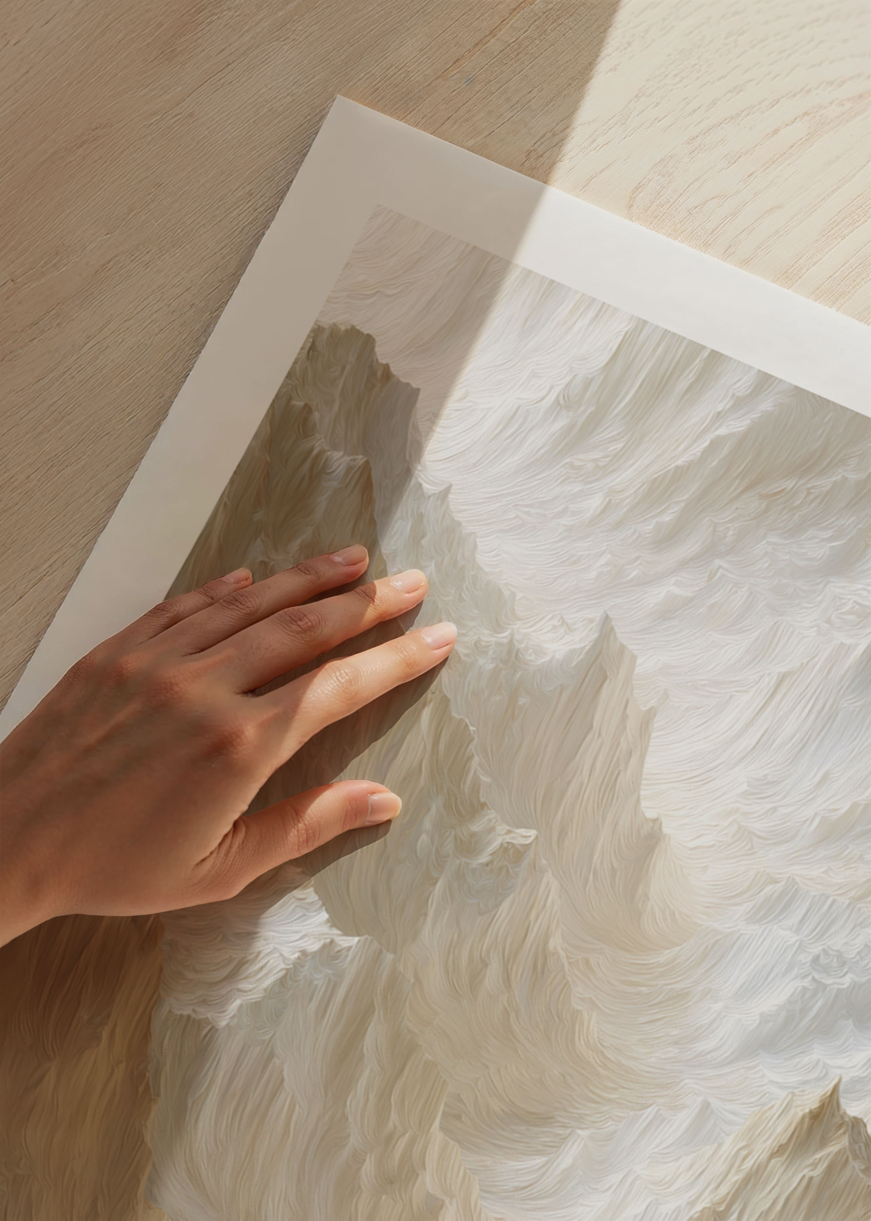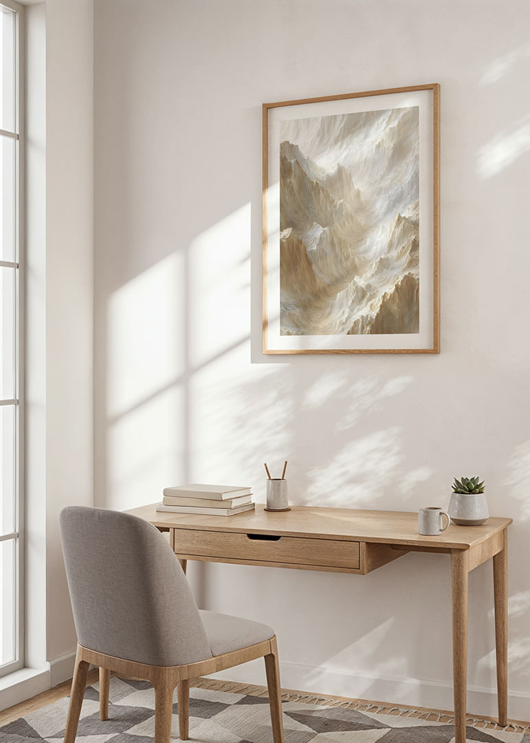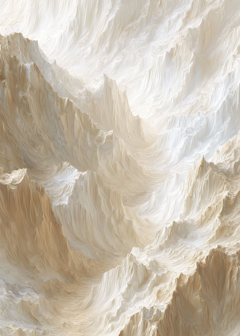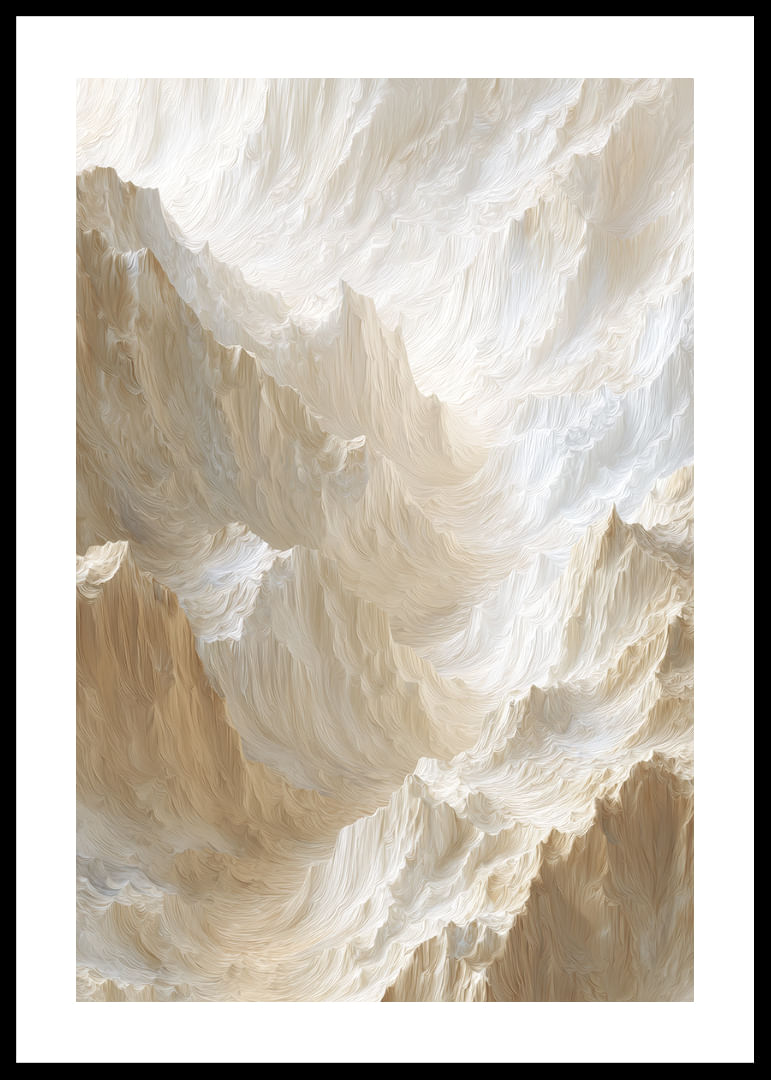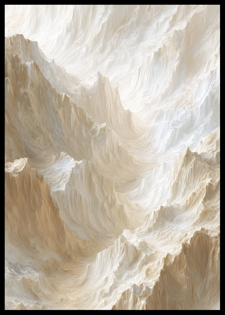 Deze poster legt een magische wereld vast waar zachte, dromerige bergformaties samensmelten in glinsterende crème- en beigetinten. De kalme stroom van lijnen en kleuren creëert een harmonieus gevoel, alsof de bergen geheimen uit een andere dimensie fluisteren. Met zijn etherische schoonheid transformeert deze poster elke kamer in een oase van rust en inspiratie.