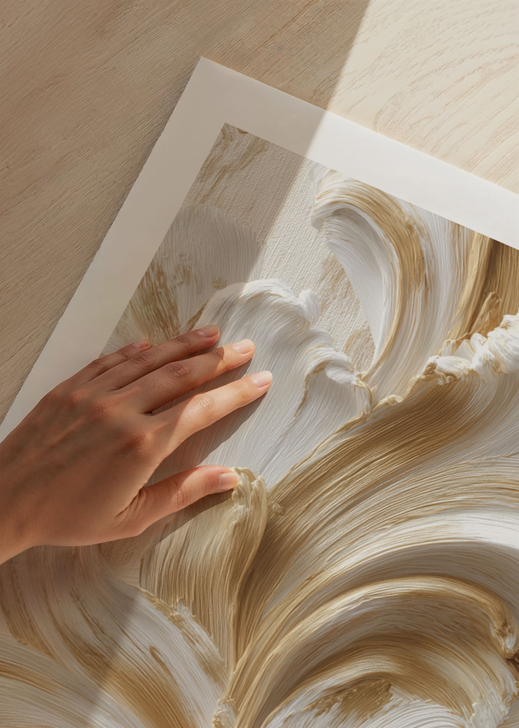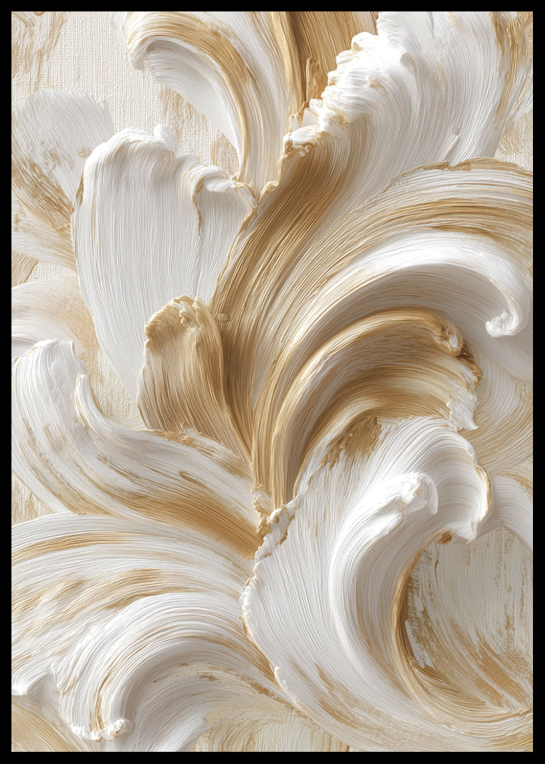 Deze poster valt op door de vloeiende gouden en witte penseelstreken die in een harmonieuze stroom lijken te dansen. Het elegante spel van licht en schaduw creëert een gevoel van beweging en diepte, waardoor de kamer een luxueuze sfeer krijgt. Deze poster is een perfecte combinatie van artistieke elegantie en visuele kracht en creëert een harmonieuze en inspirerende sfeer in huis.