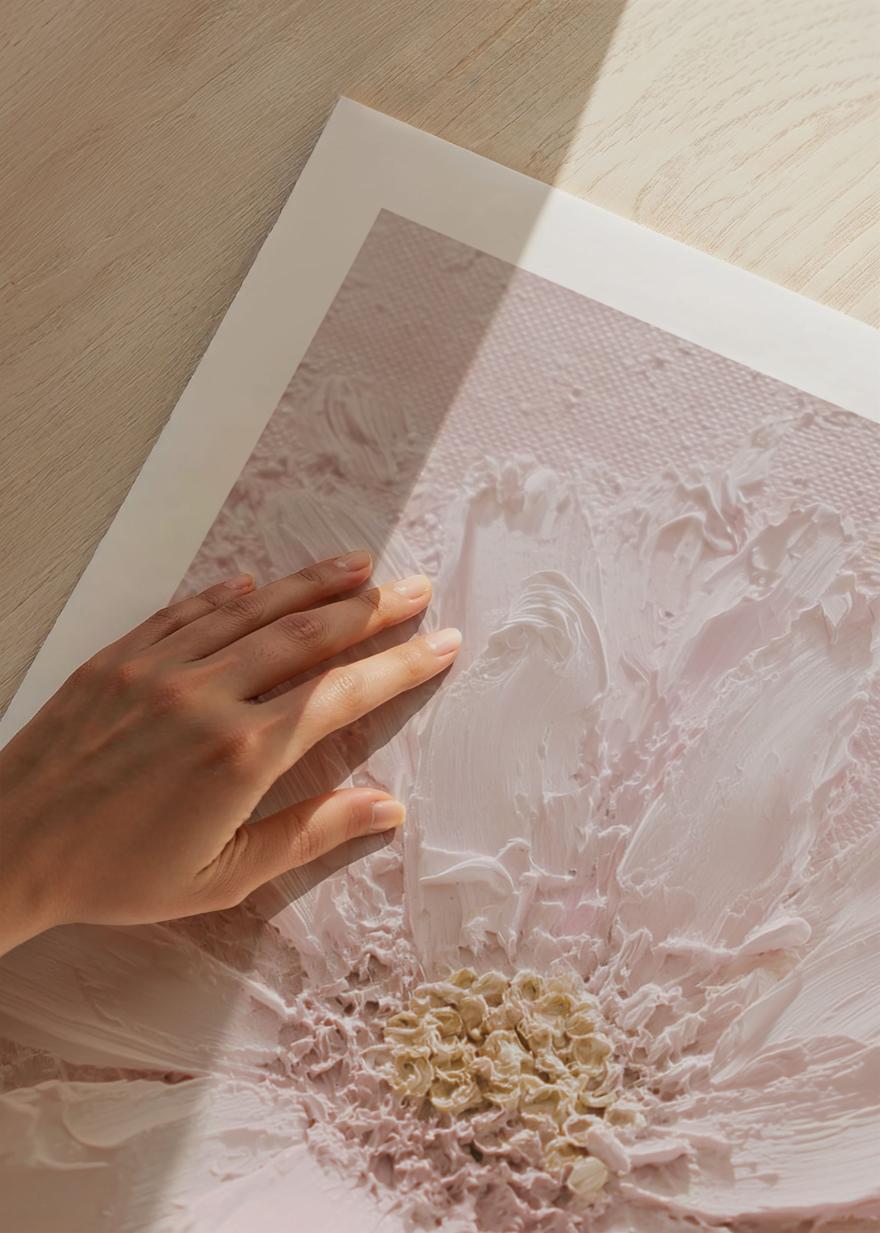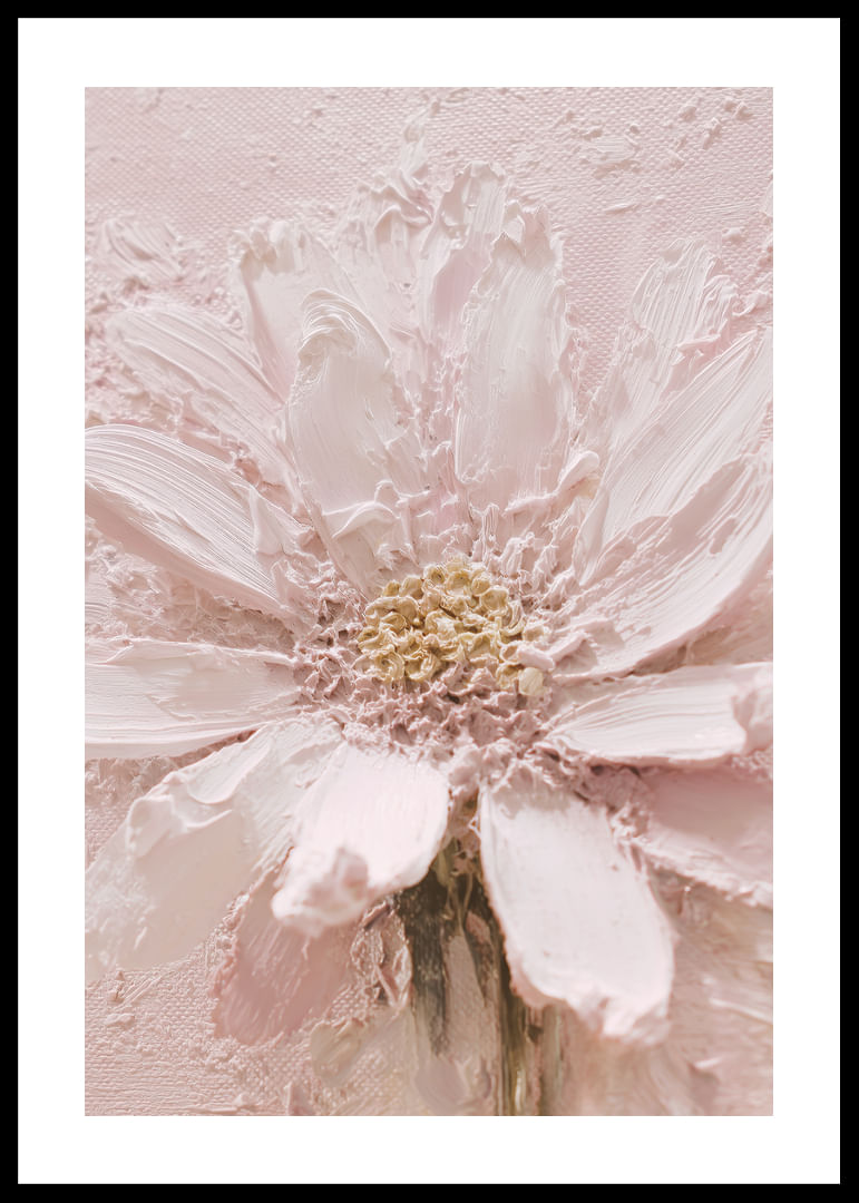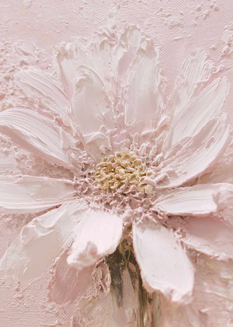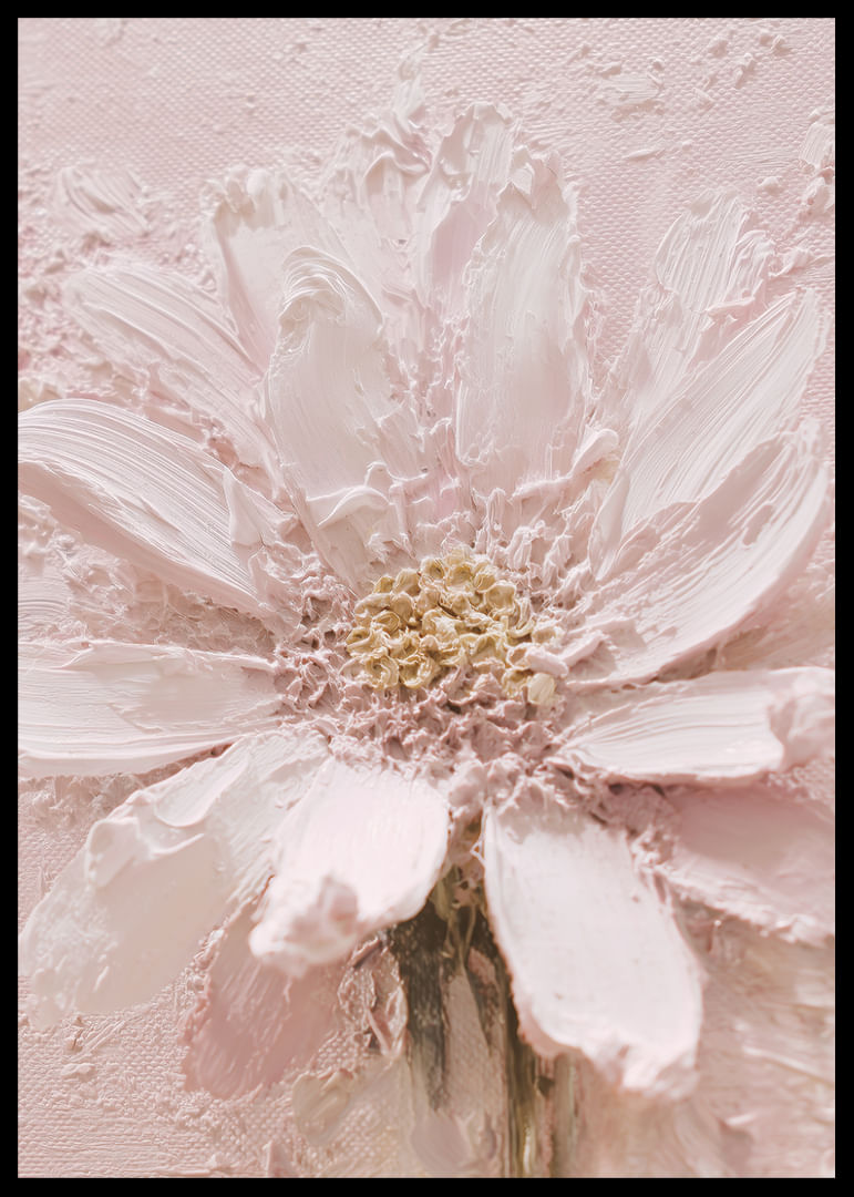 Deze poster legt een dromerige bloem vast in een zacht palet van lichtroze en witte tinten. Het schilderij schittert met textuur en diepte, waar de penseelstreken leven en beweging creëren. De bloem lijkt bijna te zweven, wat hem een ​​etherische sfeer geeft die de kamer vult met rust en elegantie. De poster transformeert elke ruimte in een oase van harmonie en schoonheid, perfect voor het creëren van een ontspannen en verfijnde sfeer.