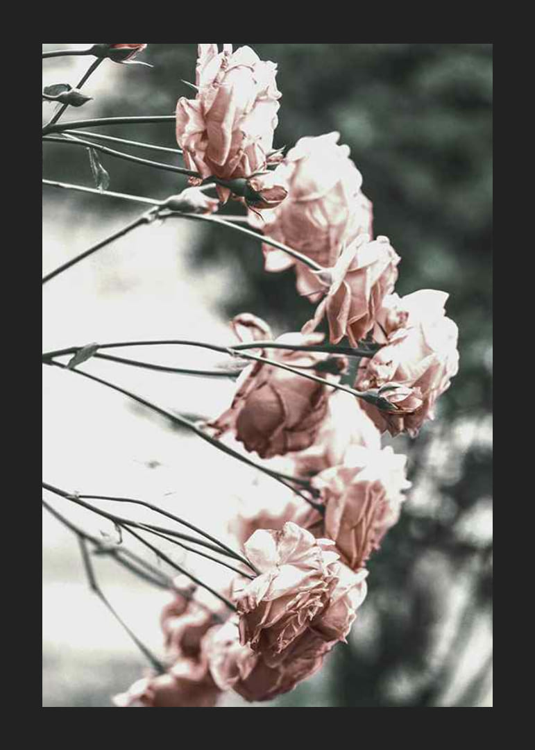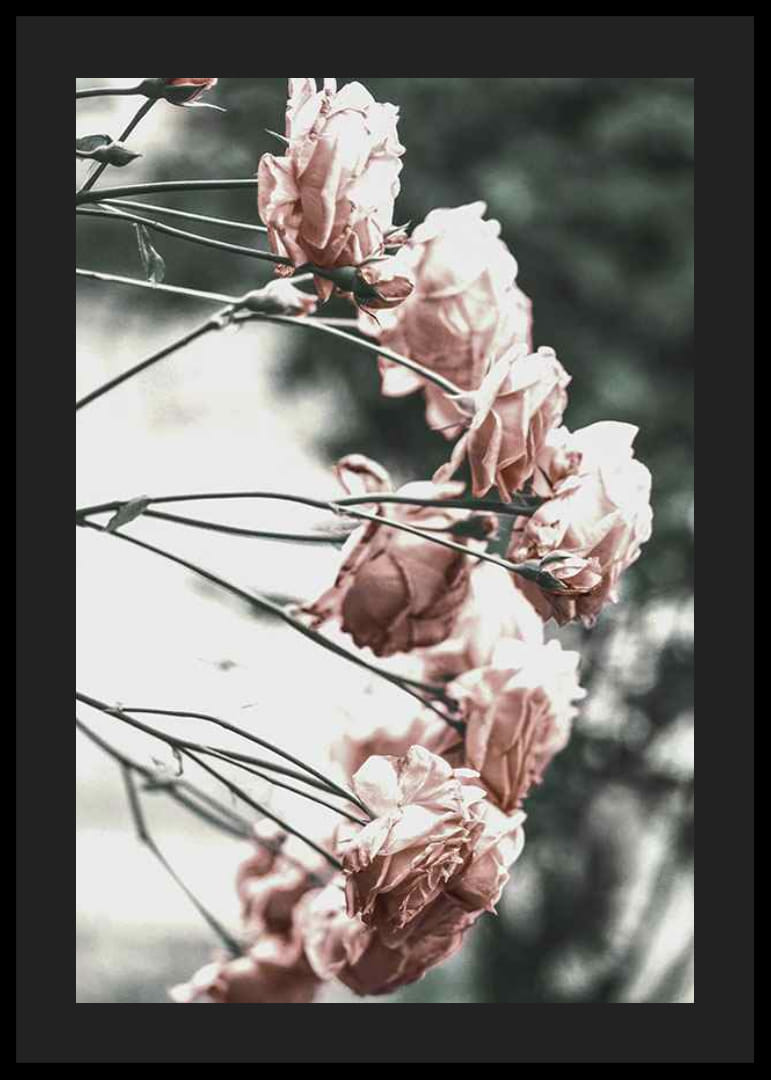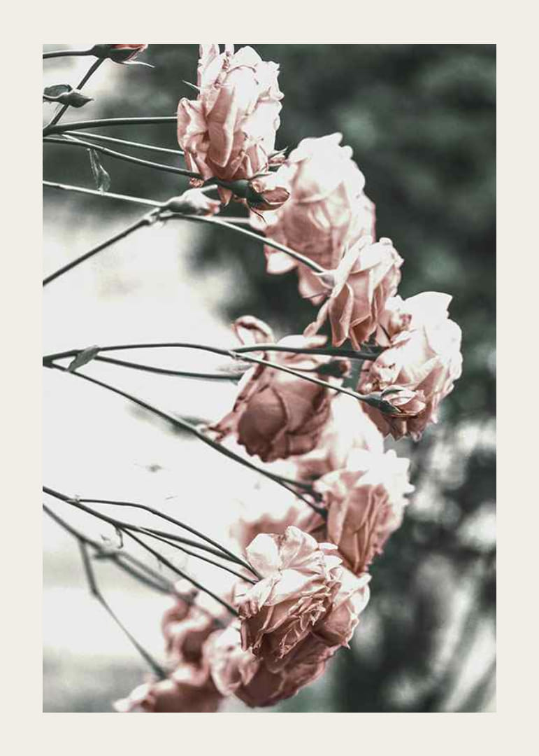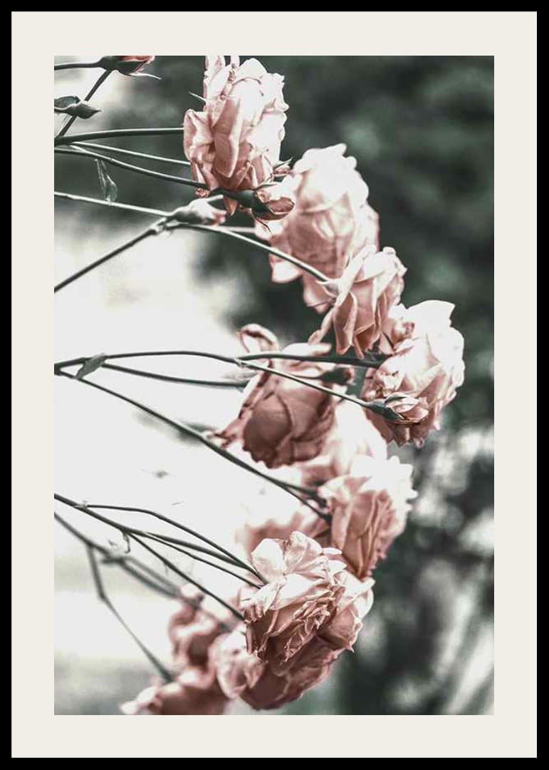 Roze rozen in zachte, lichte tinten verspreid over dunne takken tegen een wazige en minimalistische achtergrond. De bloemen zijn van opzij vastgelegd met een vleugje vroegzomerlicht, wat het motief een kalme en eenvoudige uitstraling geeft. Deze botanische poster past goed in lichte kamers en draagt ​​bij aan een natuurlijke lentesfeer.