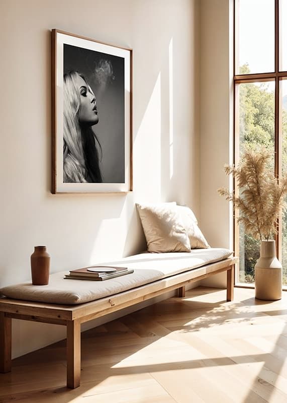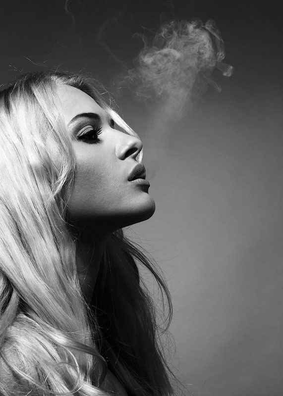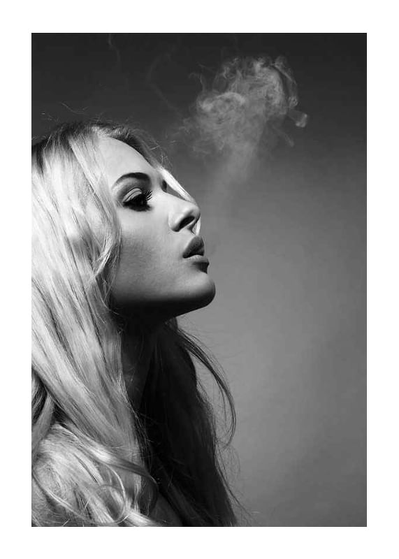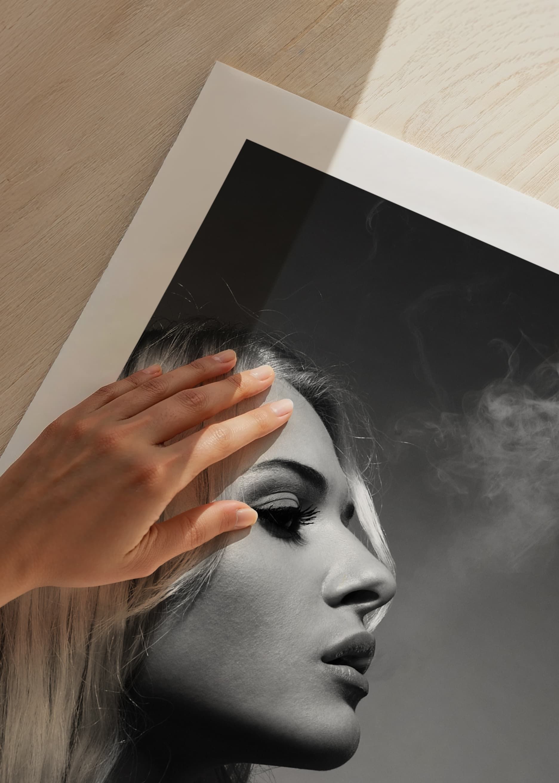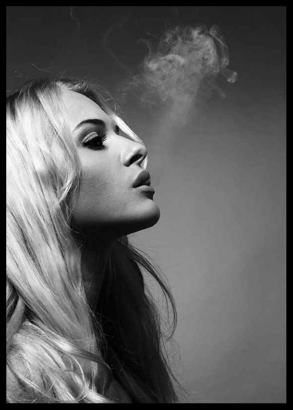 Profiel van een jonge vrouw met lang blond haar die rook uitblaast tegen een zacht wazige achtergrond. Contrasterende zwart-wittinten en heldere schaduwen geven het motief een stijlvolle en moderne uitstraling. Deze poster benadrukt mode en persoonlijkheid en is geschikt voor zowel de woonkamer, slaapkamer als hal.