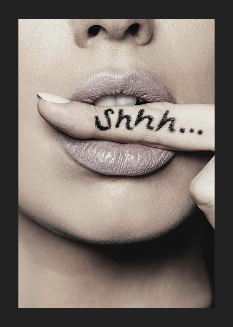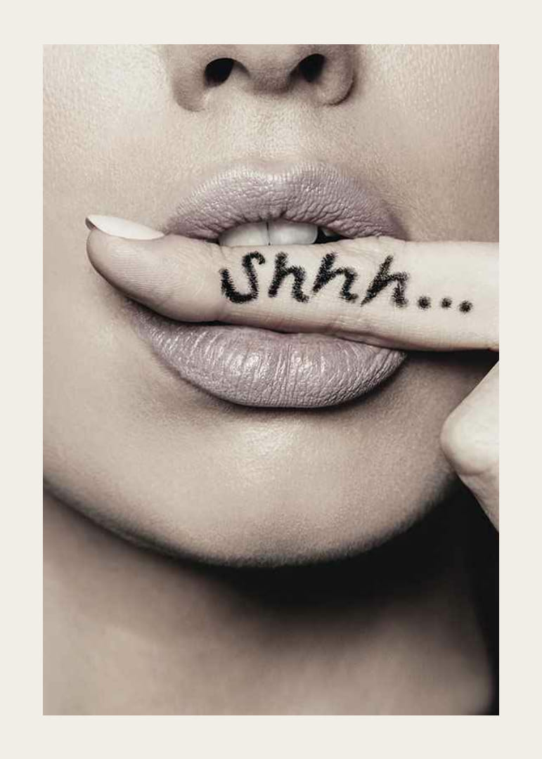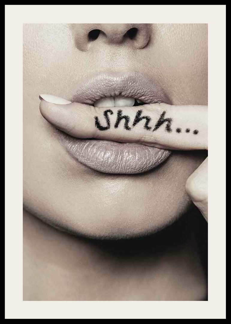 Close-up van een vrouwengezicht waar haar lippen een vinger raken met de zwarte tekst "Shhh..." erop getatoeëerd. Monochrome tinten en zachte belichting geven het motief een stijlvolle en grafische uitstraling. Een poster die past in een kleedkamer, slaapkamer of hal en een onderscheidend detail toevoegt aan een modern interieur.