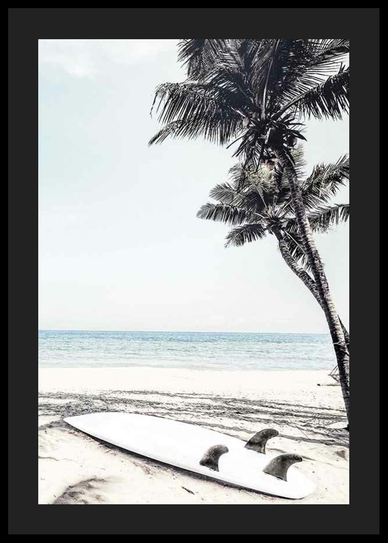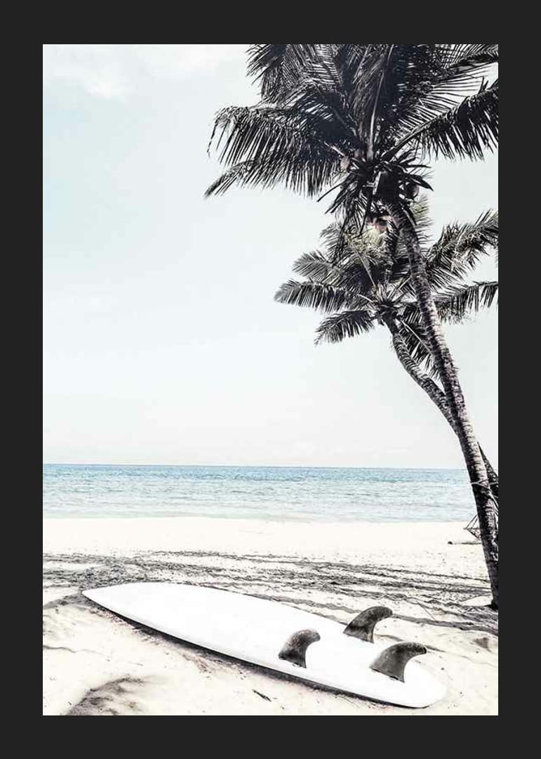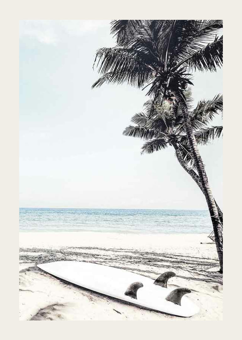 Een witte surfplank ligt in het zand naast de schaduw van twee hoge palmbomen, met een kalme blauwe zee op de achtergrond en een stralende lucht erboven. Deze poster legt de eenvoud van het strandleven en zonnige dagen vast en brengt een ontspannen sfeer in een woon- of slaapkamer. Een zomers detail in een modern interieur.