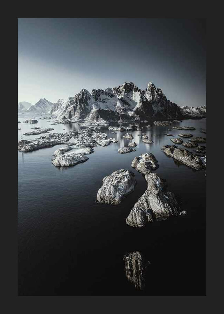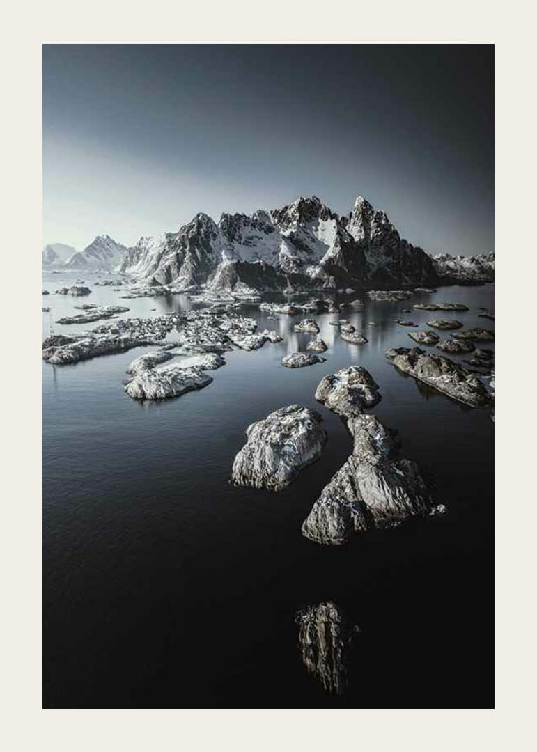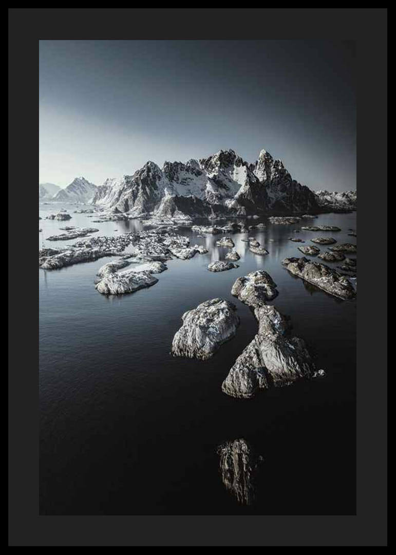 Dramatische, met sneeuw bedekte bergen rijzen op de achtergrond, omringd door een kalme, donkere zee met op de voorgrond talloze kleine, met sneeuw bedekte eilandjes. Koele blauwgrijze tinten geven het onderwerp een winterse sfeer. Deze poster combineert grootse natuur met rust en past goed in moderne woonkamers of kantoren.