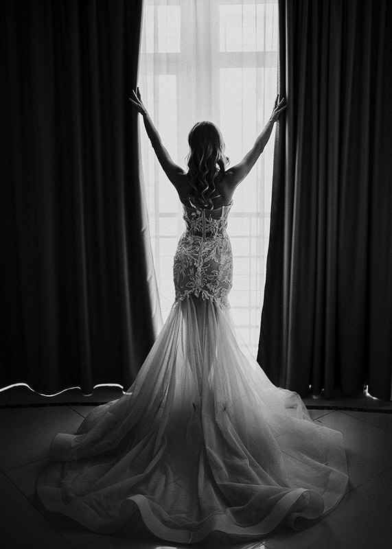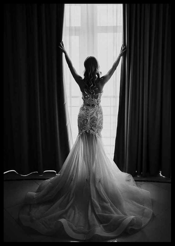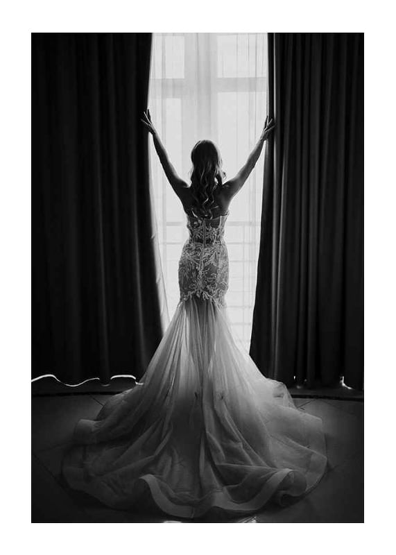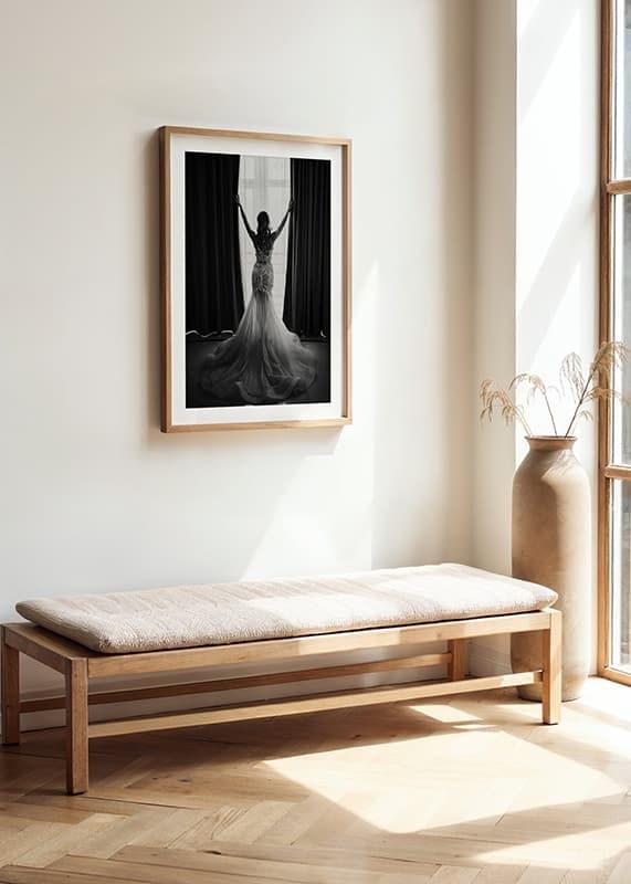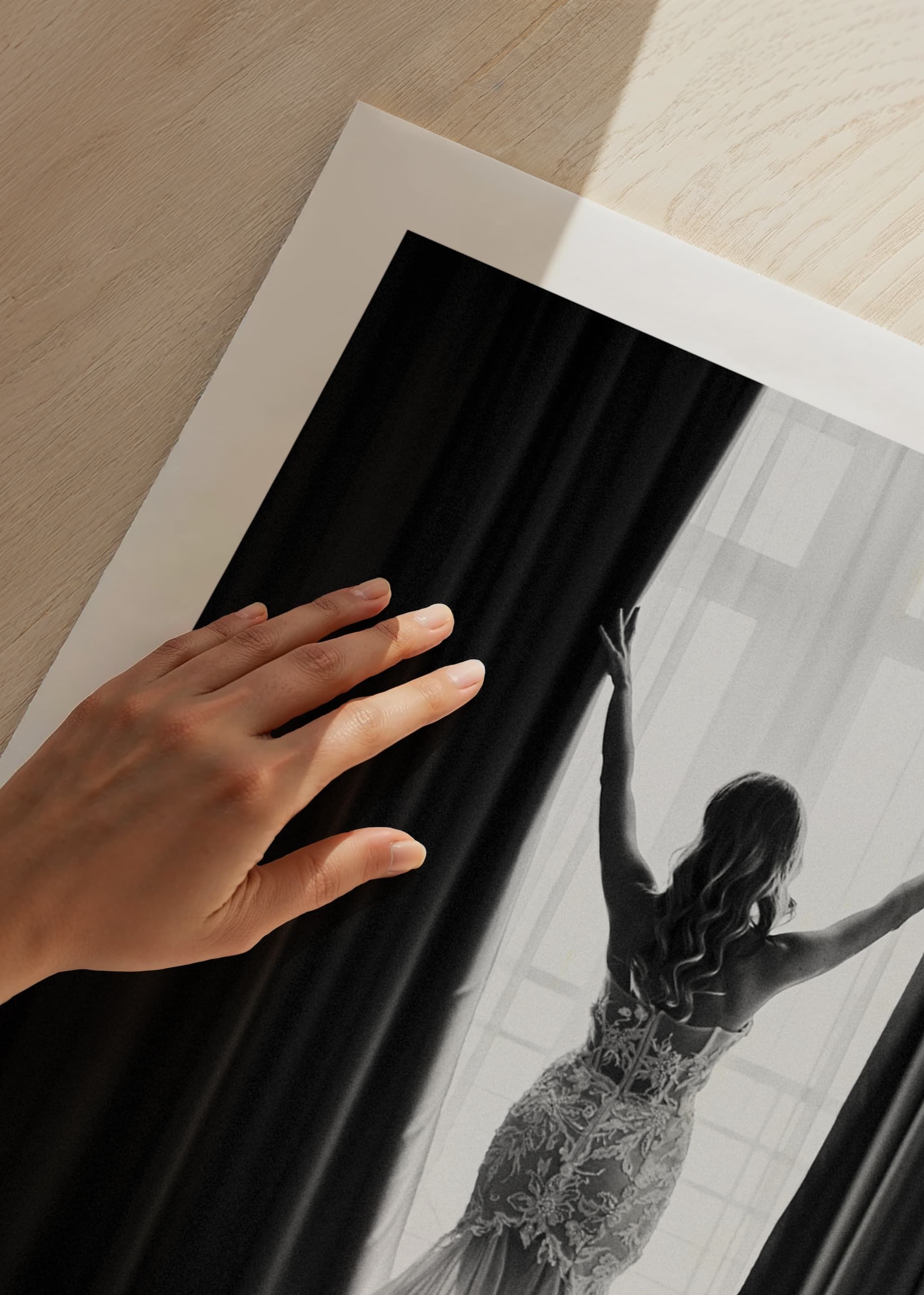 Van achteren is een vrouw in een lange, gedetailleerde kanten jurk te zien, staand tussen open, zware gordijnen, kijkend door een groot raam met zacht licht. Het silhouet en de dunne stof van de jurk vormen een elegant contrast met de donkere kamer. Een stijlvolle poster die zowel in moderne als klassieke omgevingen past.