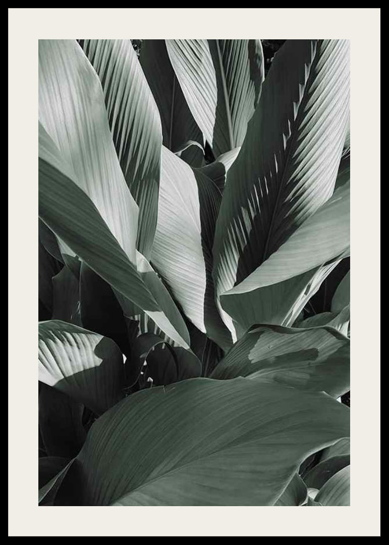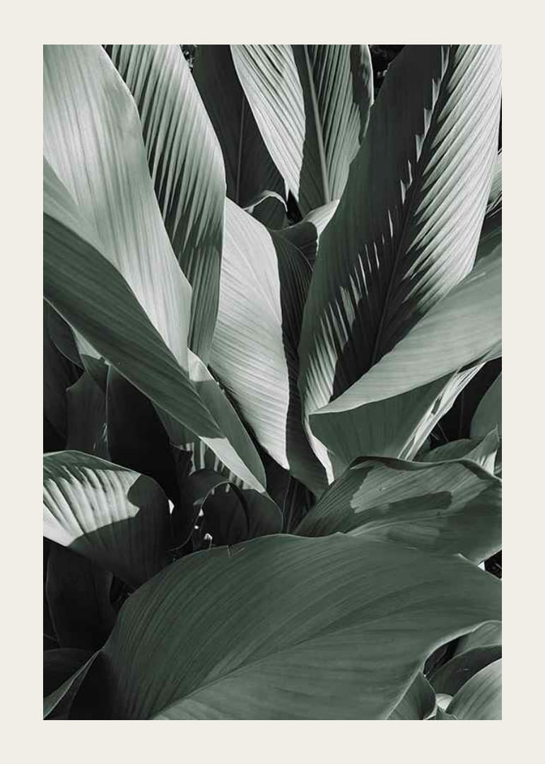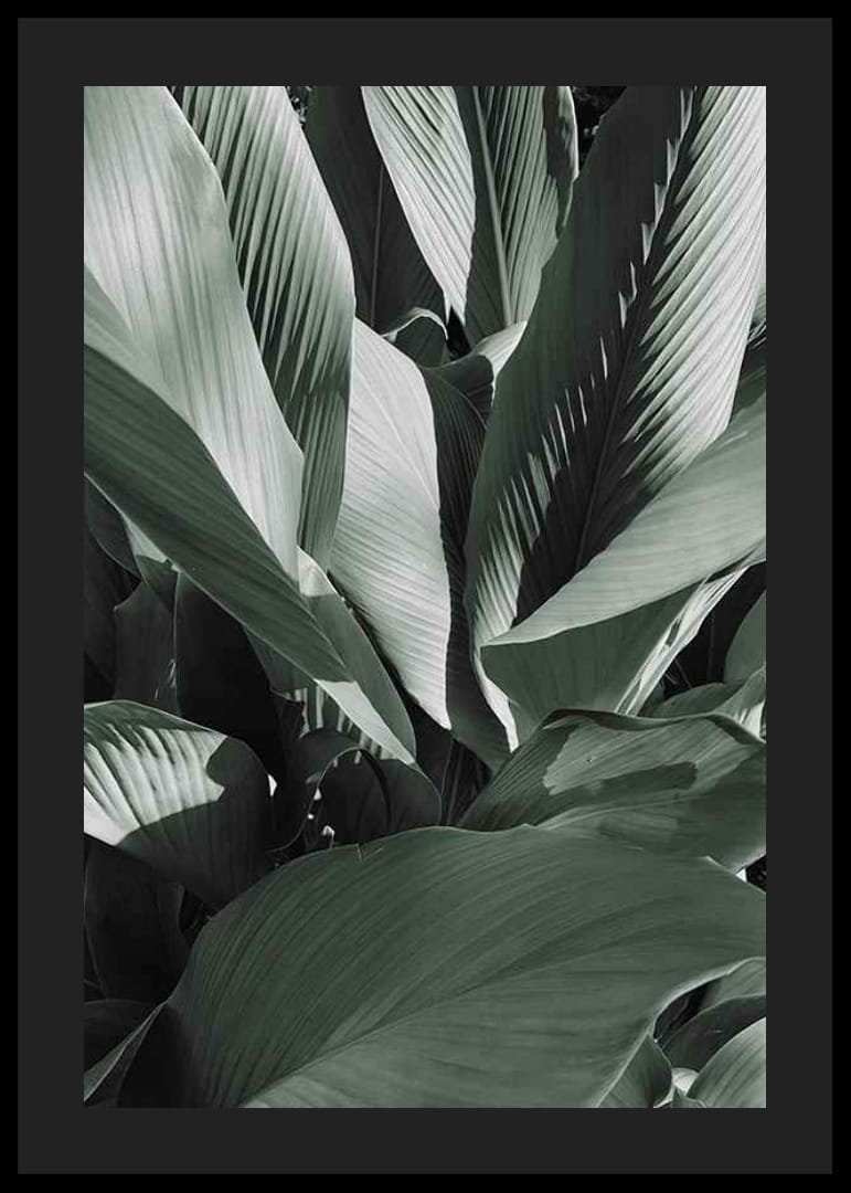 Grote bananenbladeren liggen verspreid in lagen met heldere nerven en zacht licht. Het motief wordt gedomineerd door gedempte groene tinten en schaduwpartijen, wat een kalme en natuurlijke sfeer geeft. De botanische stijl maakt deze poster bijzonder geschikt voor kamers waar je een sober en groen interieurelement wilt toevoegen.