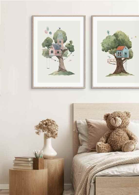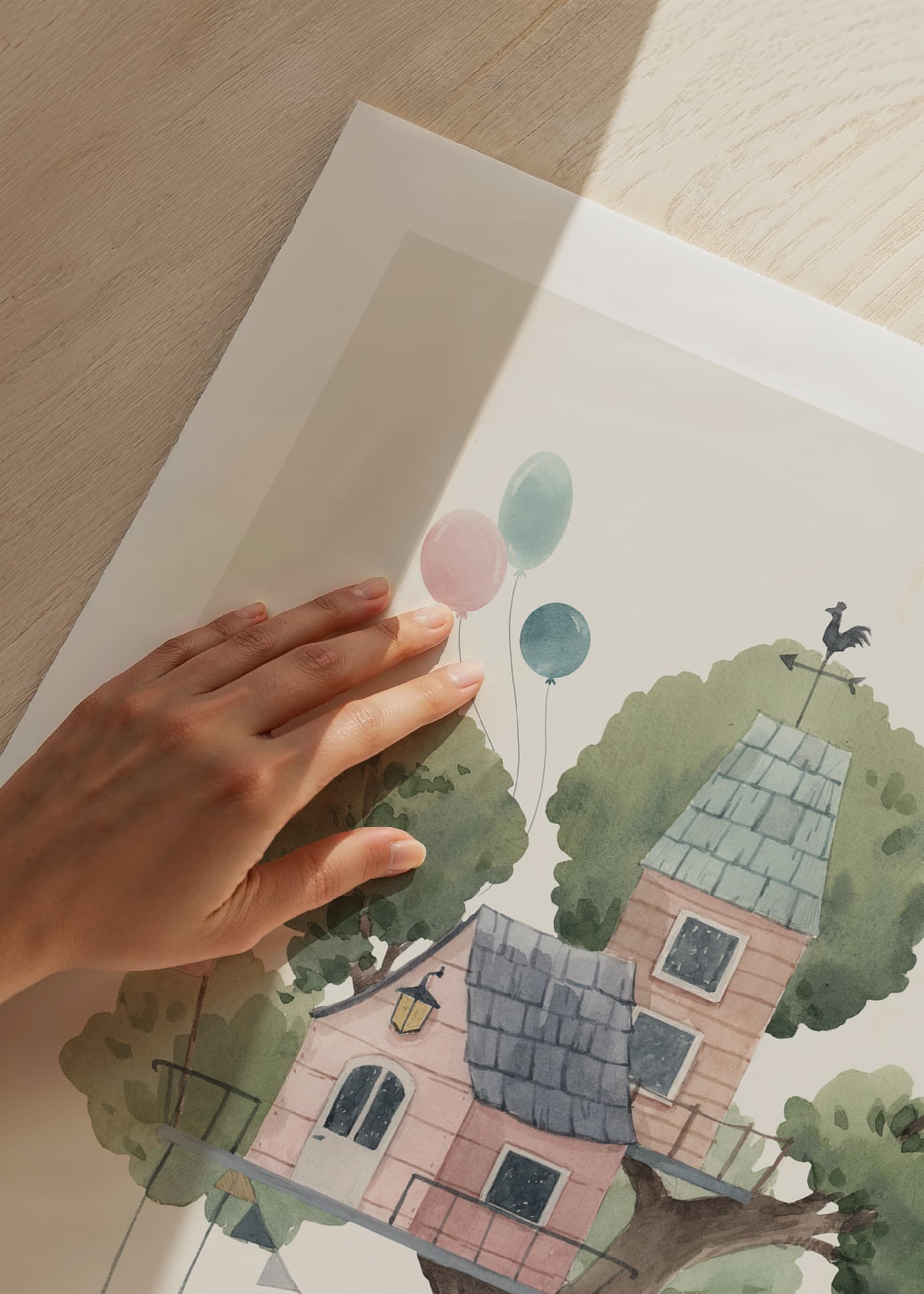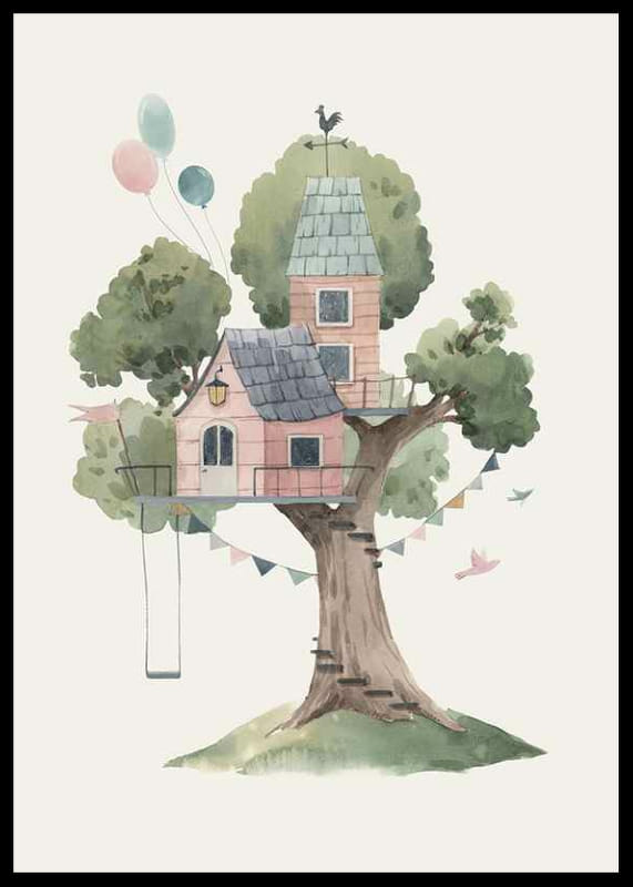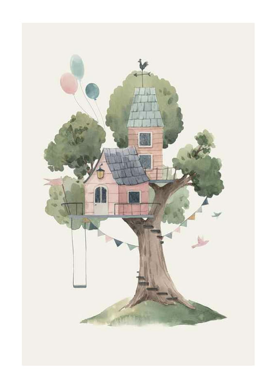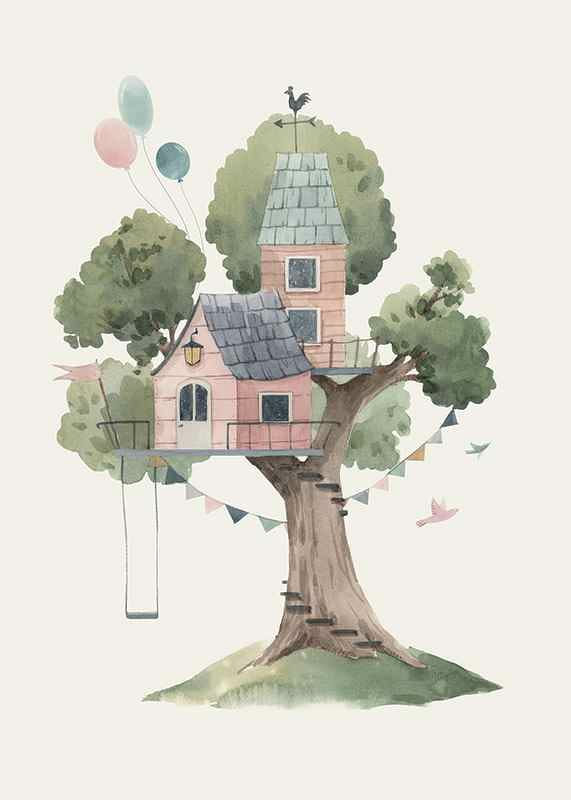 Het motief bestaat uit een speelse boomhut, geschilderd met waterverf in zachtroze en groene tinten. Het huis heeft torentjes, een blauw dak en is omringd door ballonnen en wimpels. Een houten schommel hangt aan een tak en er vliegen kleine vogeltjes rond. Deze poster kan een kinderkamer een inspirerende en fantasierijke sfeer geven.