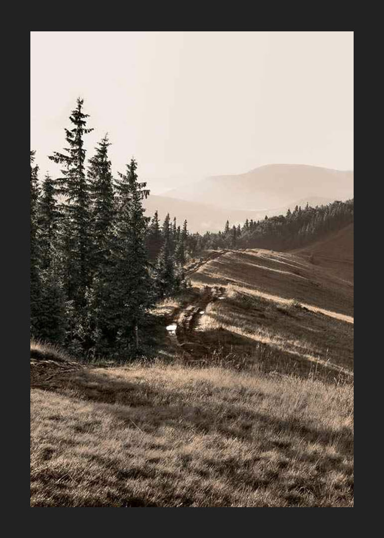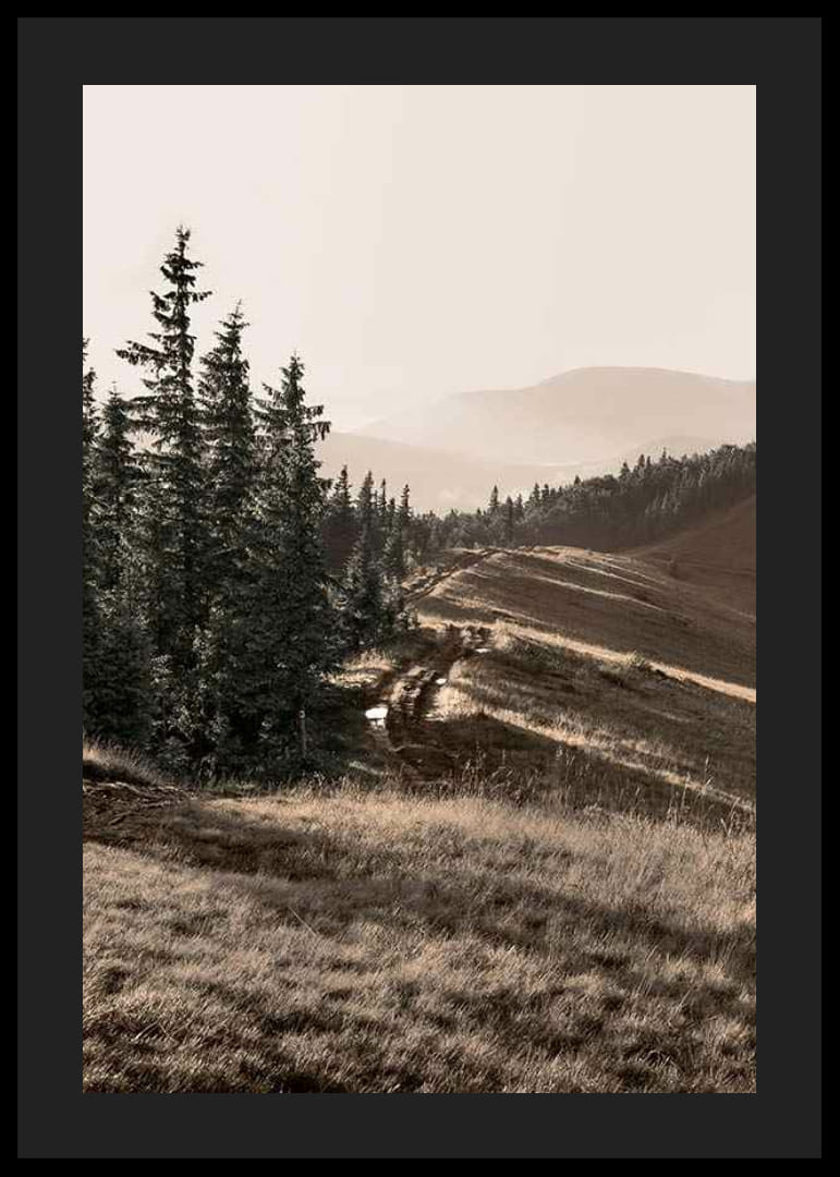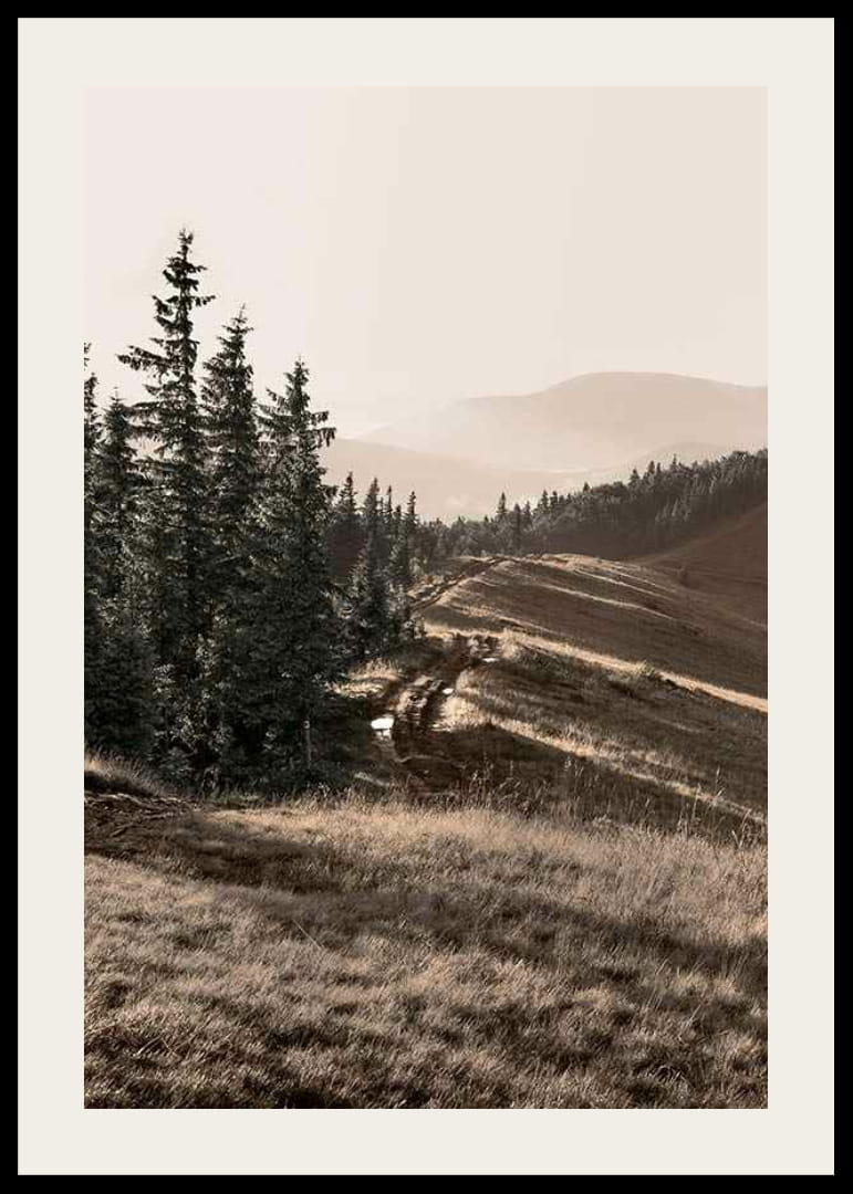 Een smal pad slingert tussen hoge sparrenbomen en open grashellingen, met de silhouetten van de Karpaten op de achtergrond. Het licht is zacht en het hele motief is uitgevoerd in gedempte, aardse kleuren. Deze poster geeft een gevoel van weidse natuur en is geschikt voor ruimtes waar natuur en rust gewenst zijn.