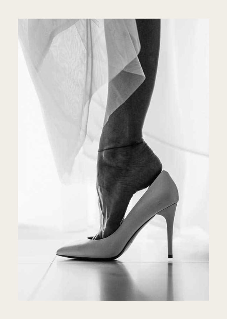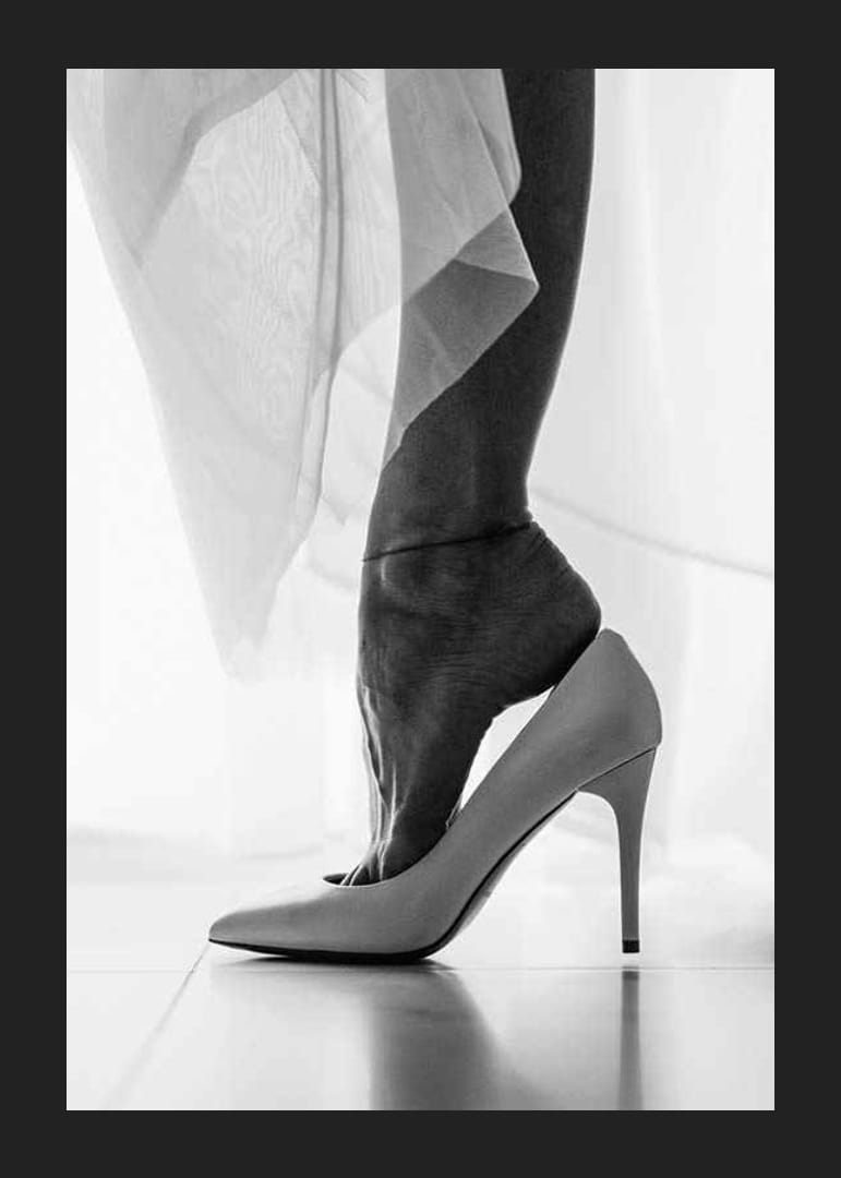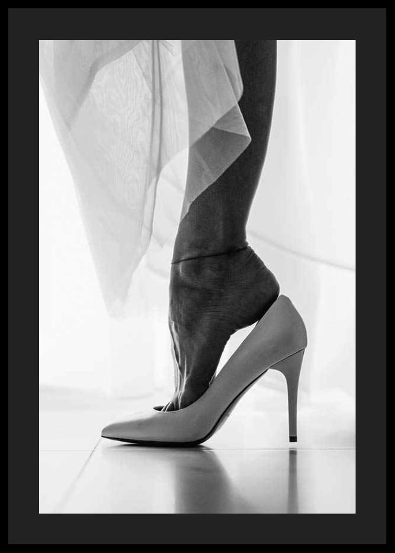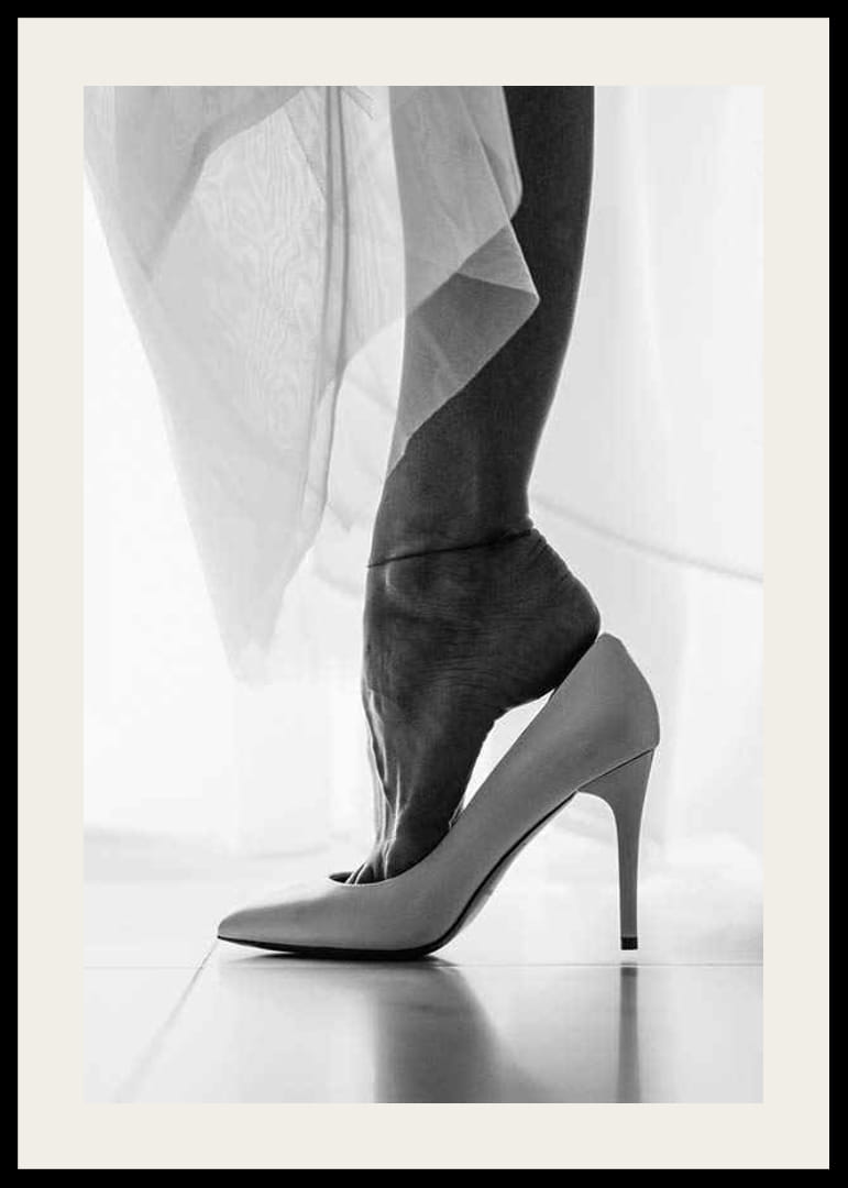 Close-up van een vrouwenvoet die in een witte schoen met hoge hak wordt geduwd. Dunne, lichte stoffen wikkelen zich om het been en geven het motief een luchtige uitstraling. Scherpe contrasten tussen de contouren van de voet en de glimmende schoen geven de poster een stijlvolle en moderne uitstraling. Geschikt als detail in zowel de slaapkamer als de hal.