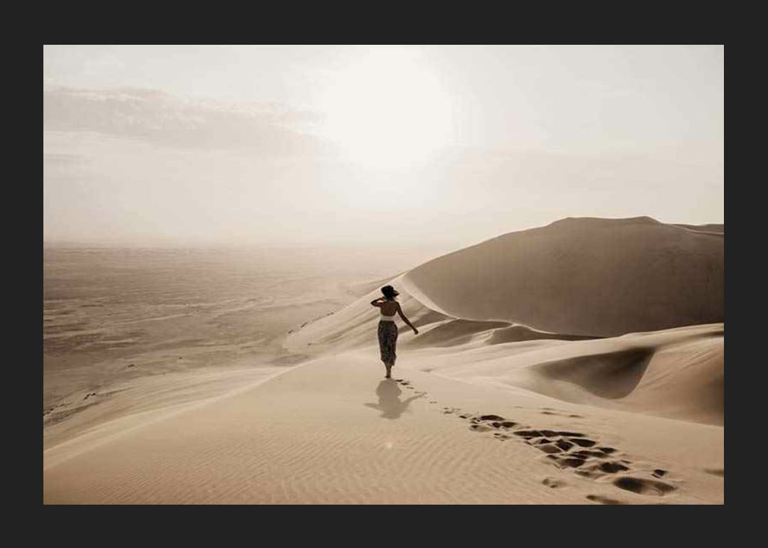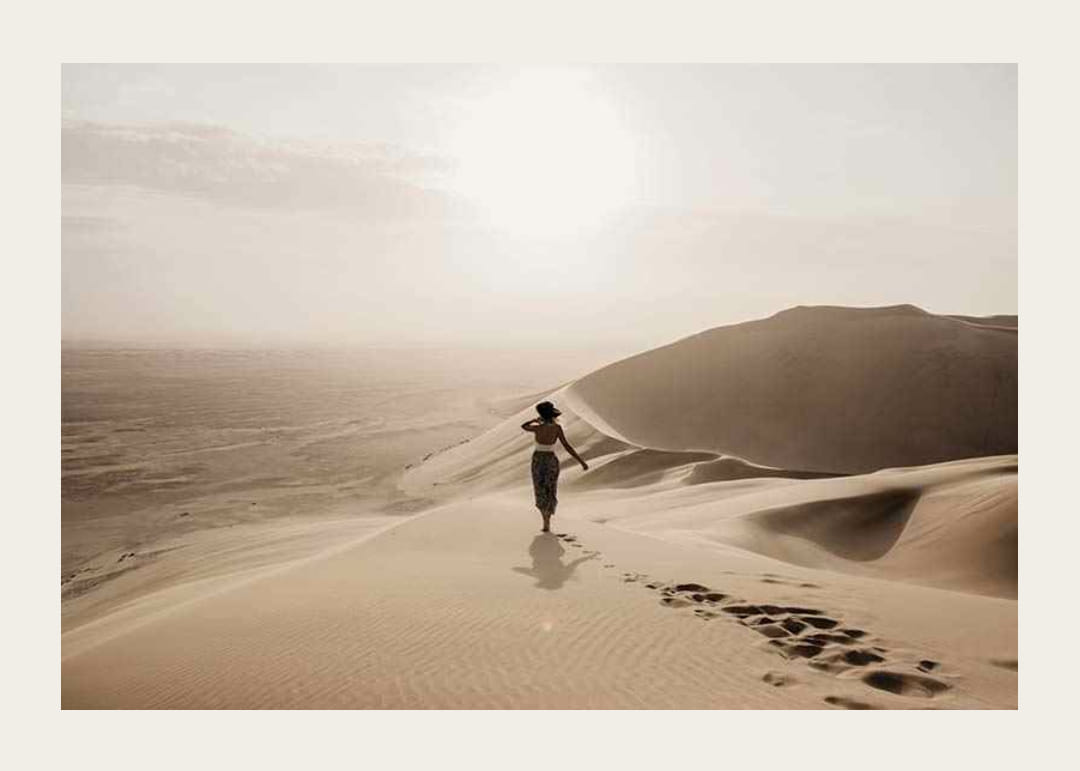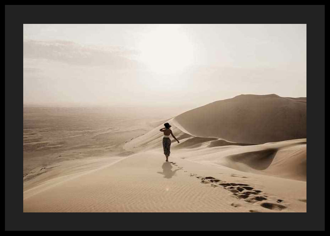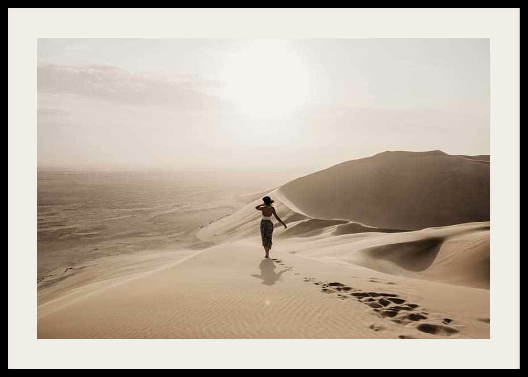 Een eenzame vrouw met hoed loopt blootsvoets over zachte zandduinen, omringd door een uitgestrekt woestijnlandschap in gedempte beige en gouden tinten. Het spel van het licht over het zand en de horizon creëert een serene indruk. Deze poster geeft de kamer een gevoel van ruimte en rust en is perfect voor een woonkamer, slaapkamer of studeerkamer.