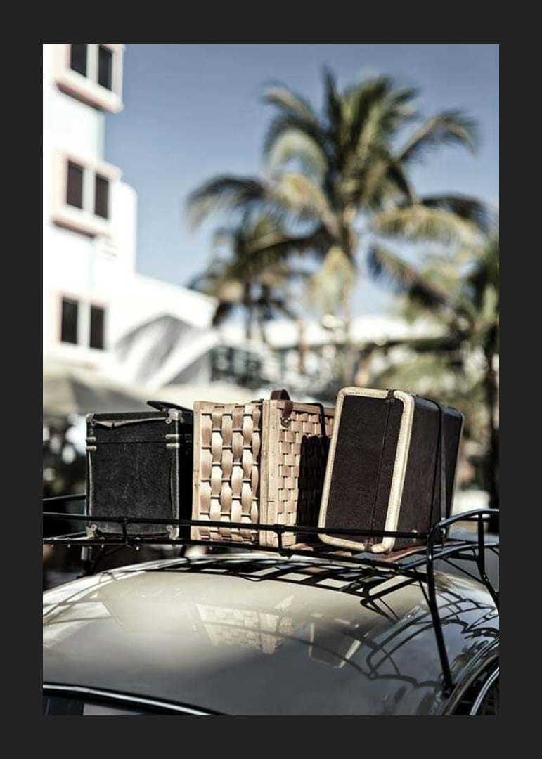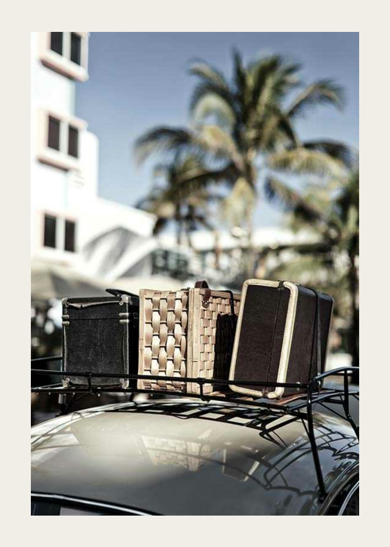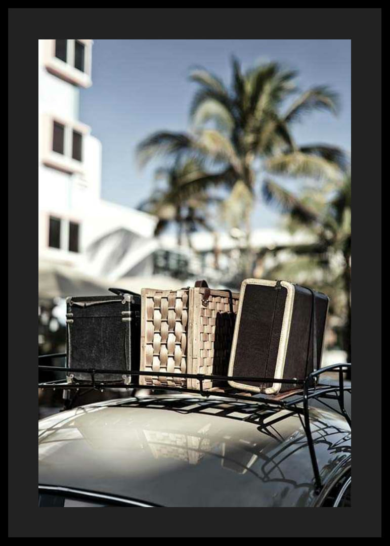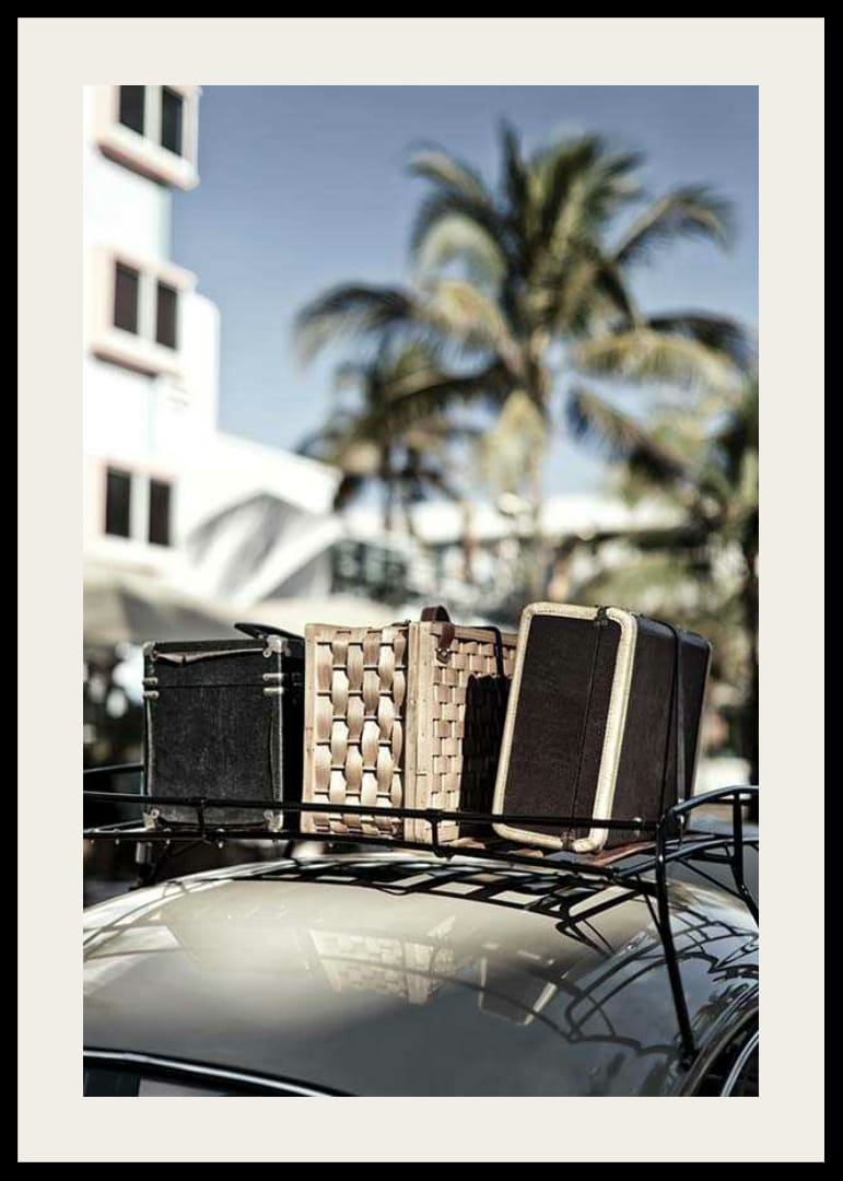 Oude koffers in verschillende materialen en kleuren staan ​​op een autorailing, met palmbomen en een hotelachtig huis vaag op de achtergrond. Een zonovergoten tafereel met een retrostijl die een gevoel van vakantie en nostalgie creëert. Perfect om een ​​woonkamer of hal een ontspannen, zomerse sfeer te geven met deze poster.