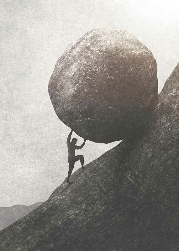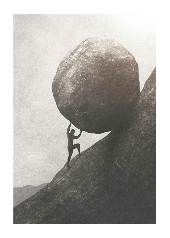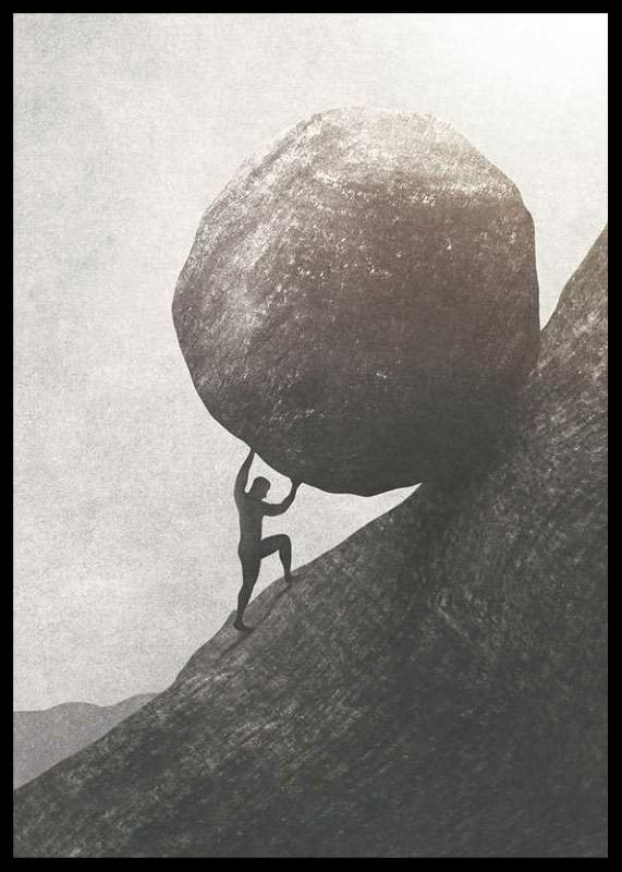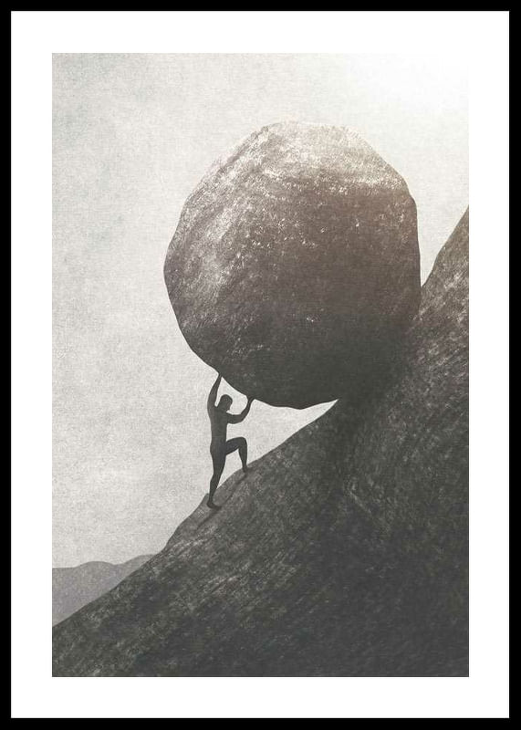 Het motief bestaat uit een eenzaam menselijk silhouet dat worstelt om een ​​enorme steen een steile klif op te rollen. Zwart-wit en grijstinten, samen met zachte schaduwen, creëren een surrealistisch gevoel van weerstand en kracht. Deze poster is een doordacht element voor bijvoorbeeld een studeerkamer of hal.