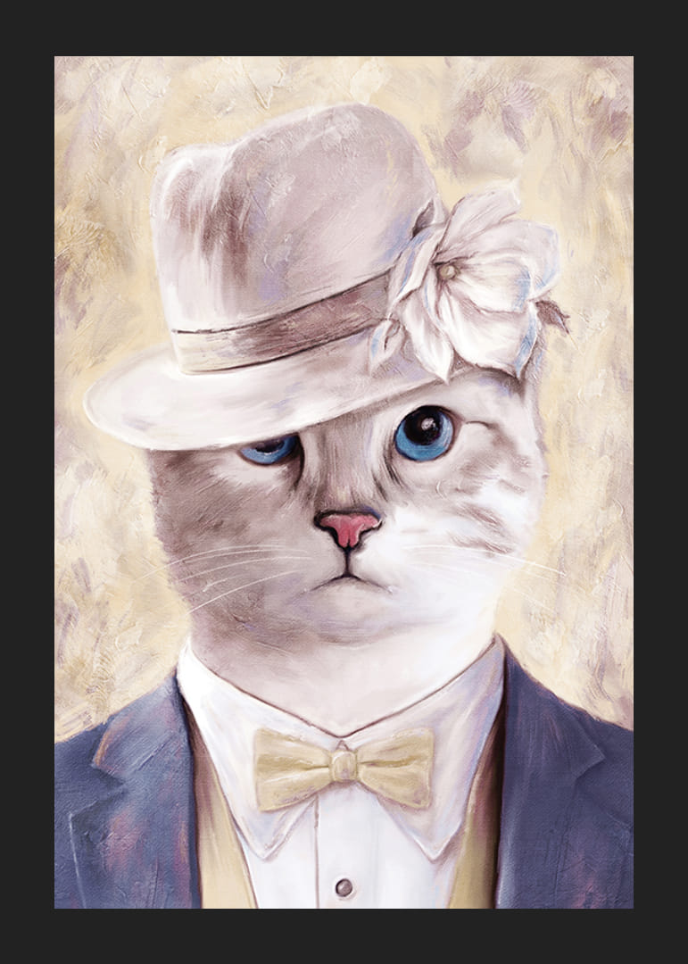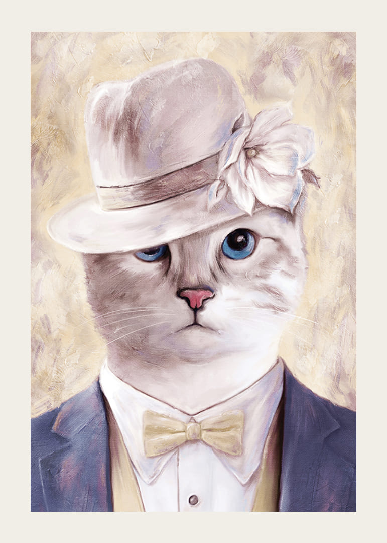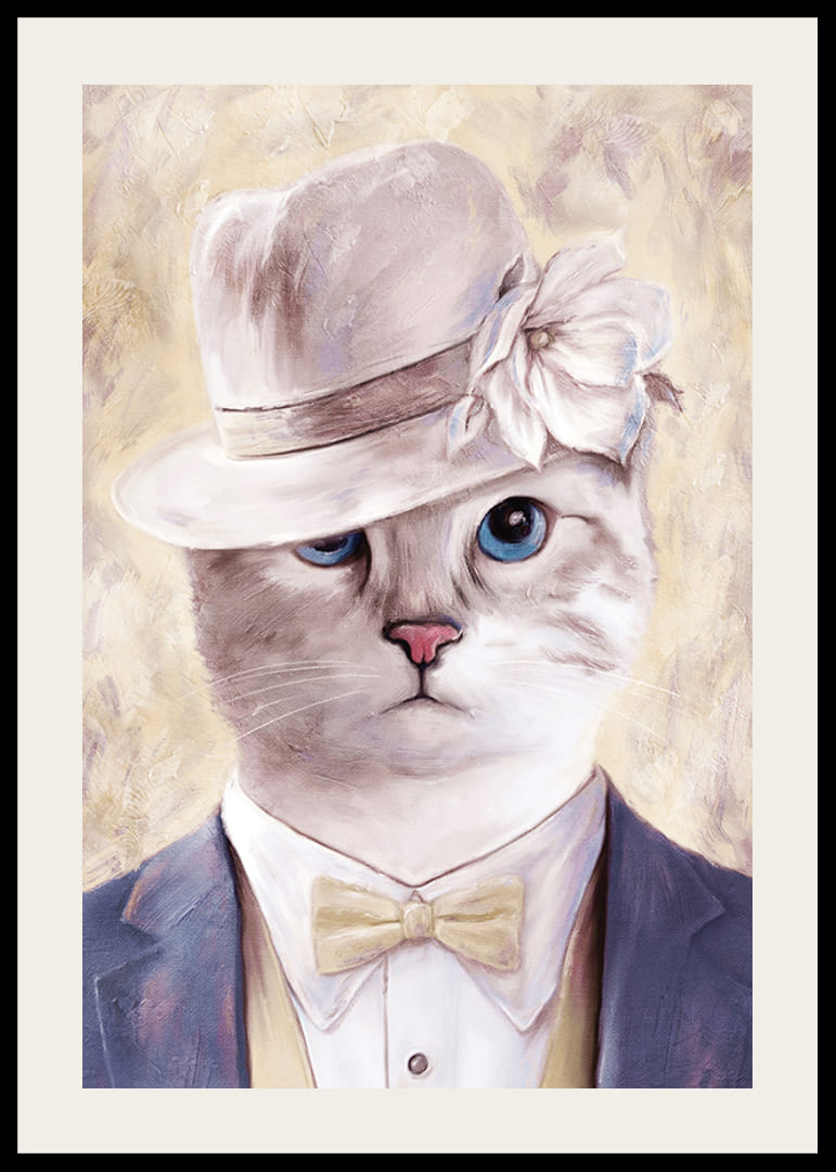 Het motief bestaat uit een gestileerde kat met een lichte vacht en grote blauwe ogen, gekleed in een pak, overhemd en gele vlinderdas. De kat draagt ​​een lichte hoed met bloemendecoratie, wat een speelse, maar toch elegante uitstraling geeft. De zacht geschilderde achtergrond in beige tinten geeft de poster een warme uitstraling, vooral mooi in kinderkamers of creatieve omgevingen.