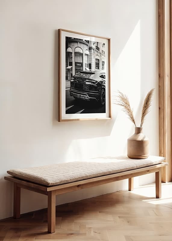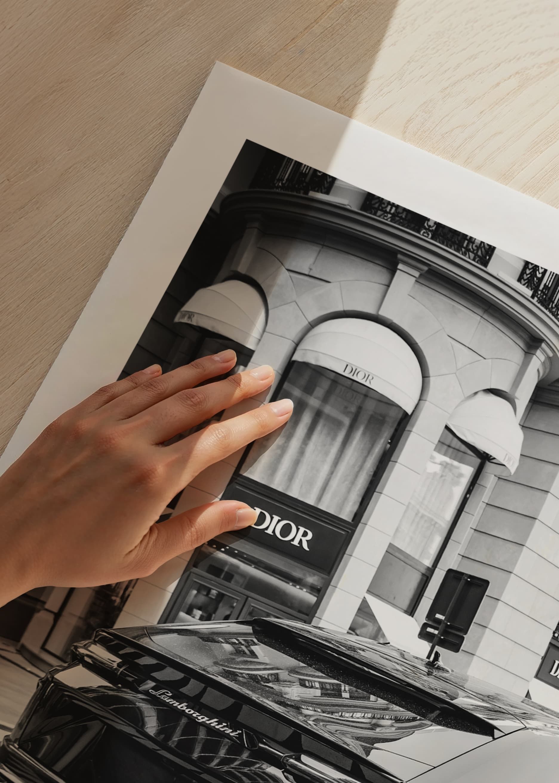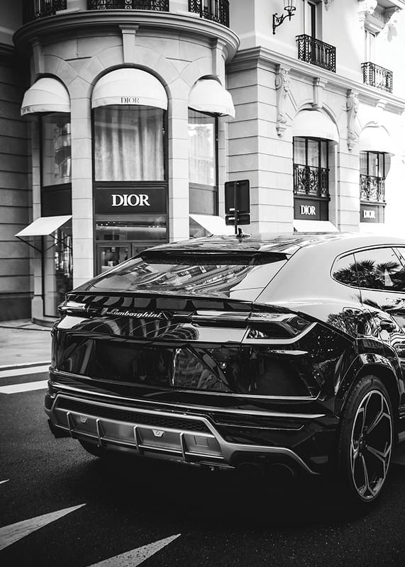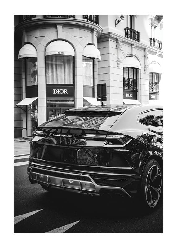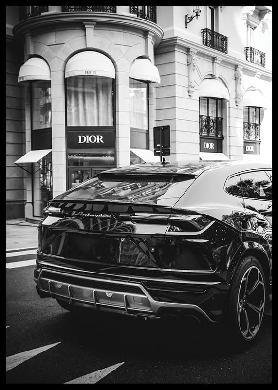De achterkant van een zwarte Lamborghini SUV domineert de afbeelding, terwijl de exclusieve Dior-winkel op de achtergrond zichtbaar is. De stedelijke setting met klassieke gevels en grote etalages in zwart-wittinten geeft de poster een urbane, luxe en stijlvolle uitstraling, perfect voor wie van mode, auto's en tijdloze elegantie houdt.