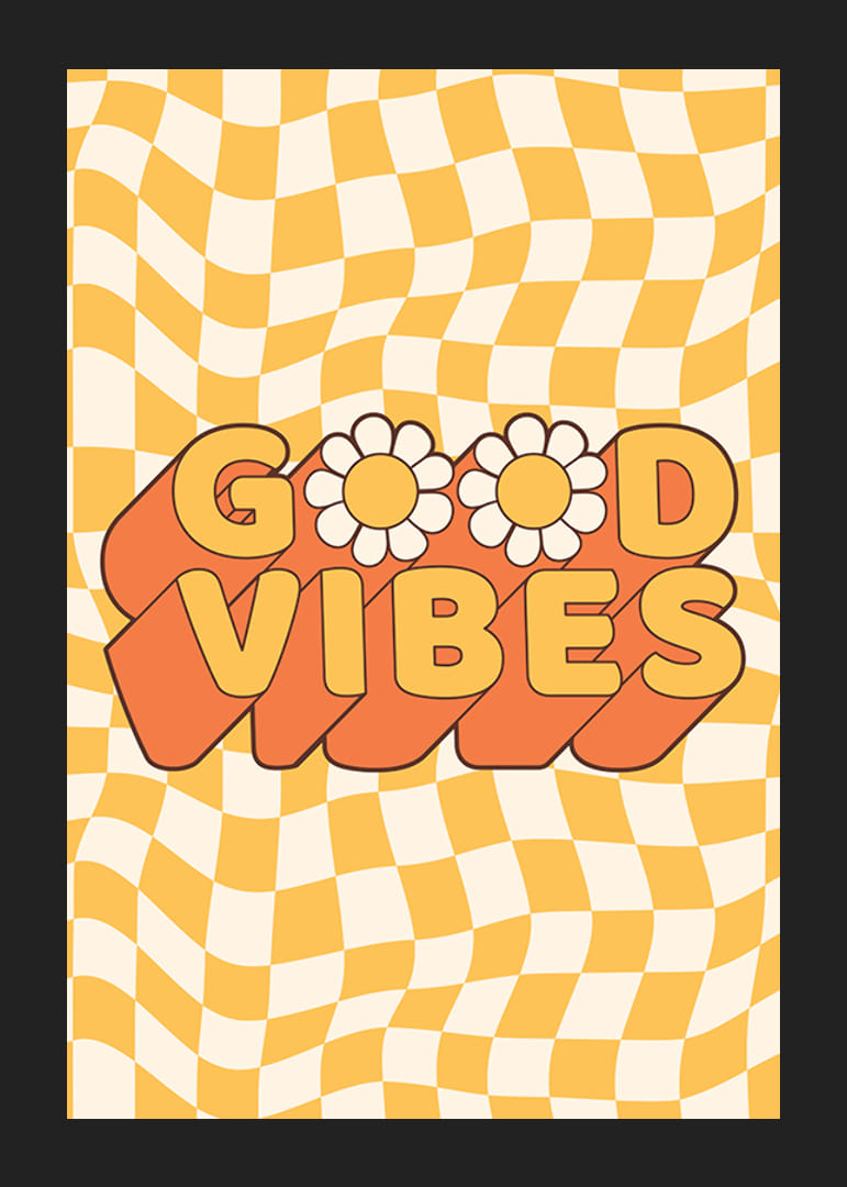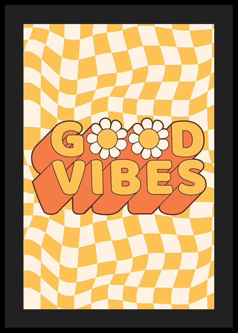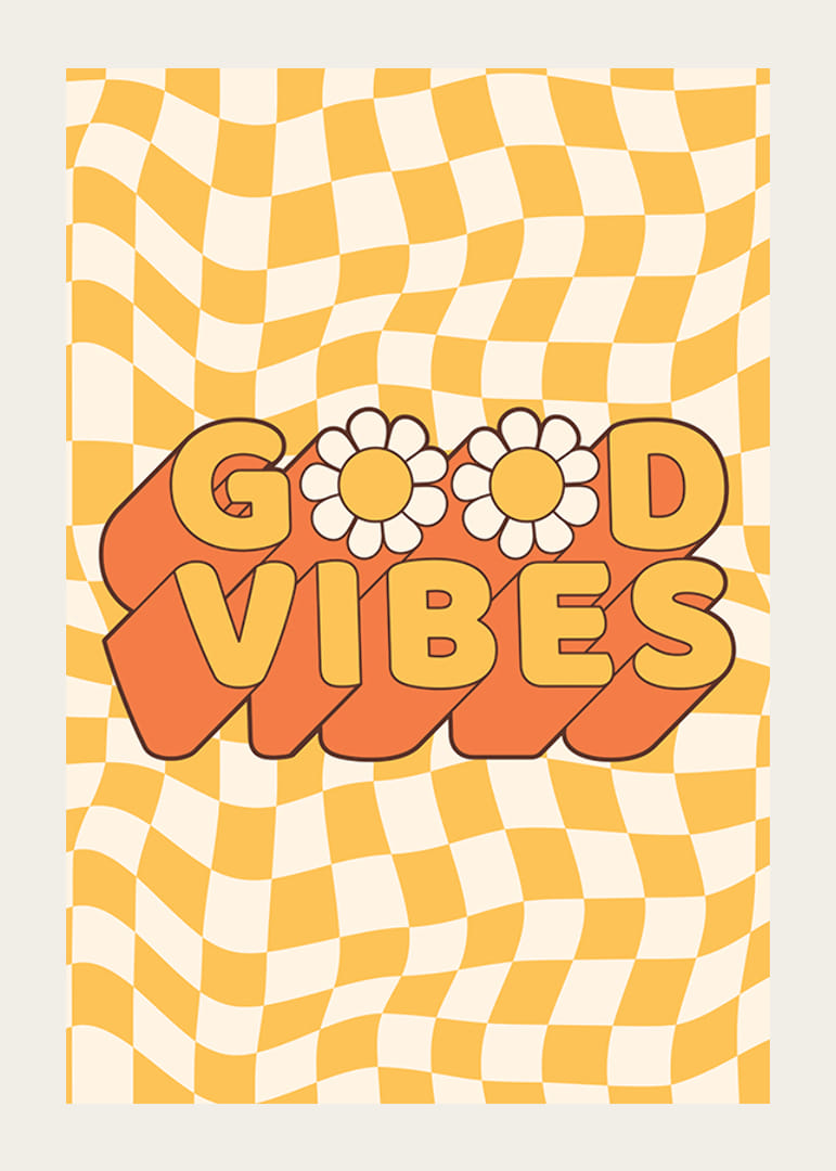 Het motief bestaat uit de tekst Good Vibes in grote letters met twee madeliefjes als O en een golvende oranje schaduw. De achtergrond is een geel en beige ruitpatroon in een golvende, jaren zeventig-geïnspireerde stijl. Deze poster geeft een speelse en retro-achtige uitstraling aan een kinderkamer, hal of creatieve ruimte.