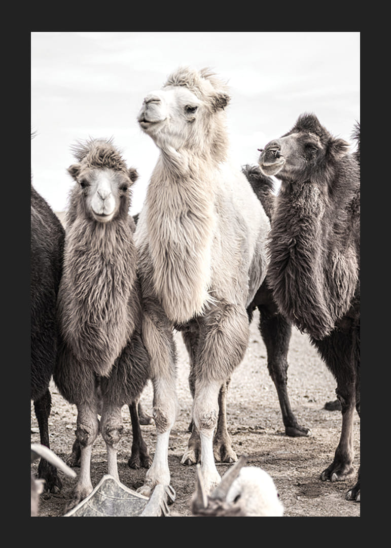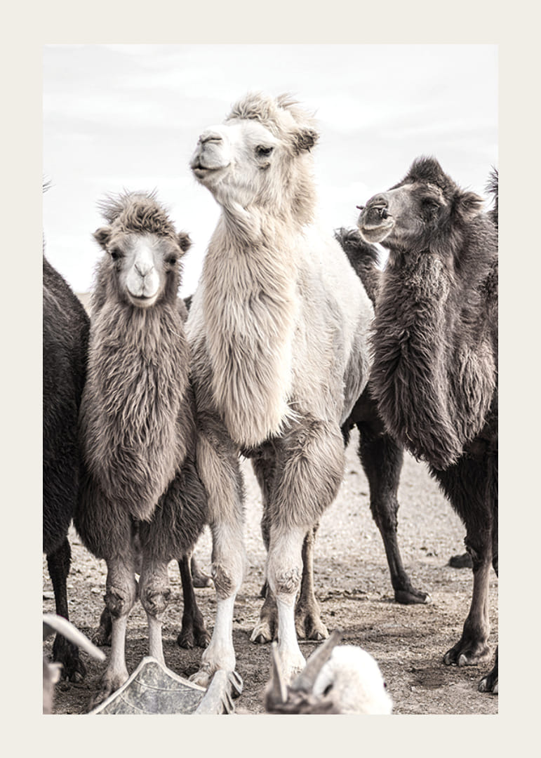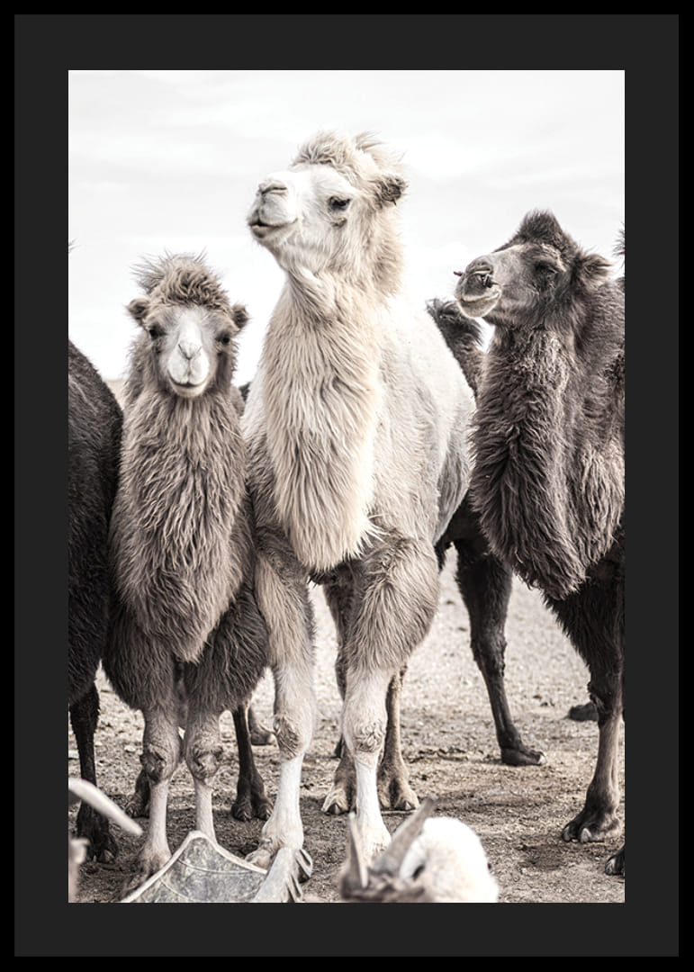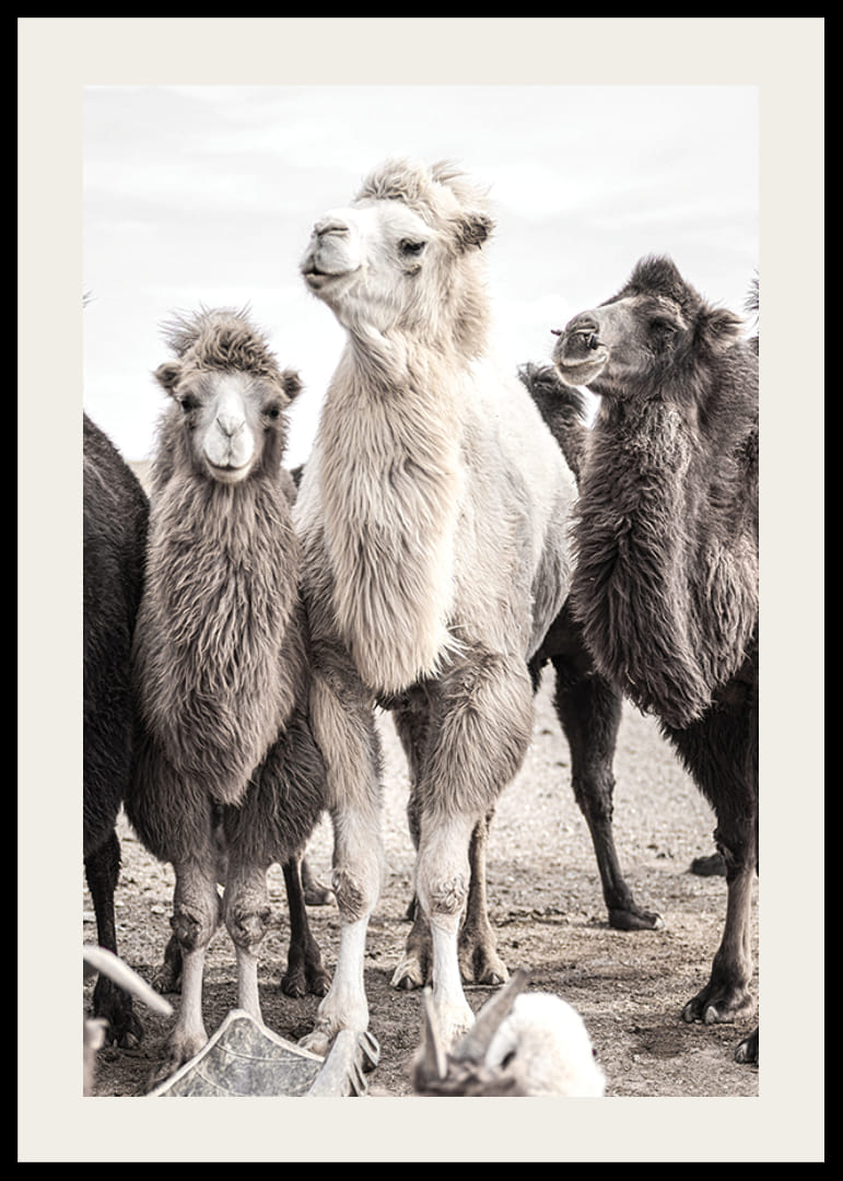 Drie kamelen staan ​​dicht bij elkaar in een open landschap, met een duidelijk zichtbare vacht in zachte grijs- en beigetinten. Het natuurlijke licht accentueert de structuren en uitdrukkingen van de dieren op een sobere manier. Deze poster creëert een natuurlijke sfeer en is geschikt voor ruimtes waar u een element van dieren en wildernis wilt.