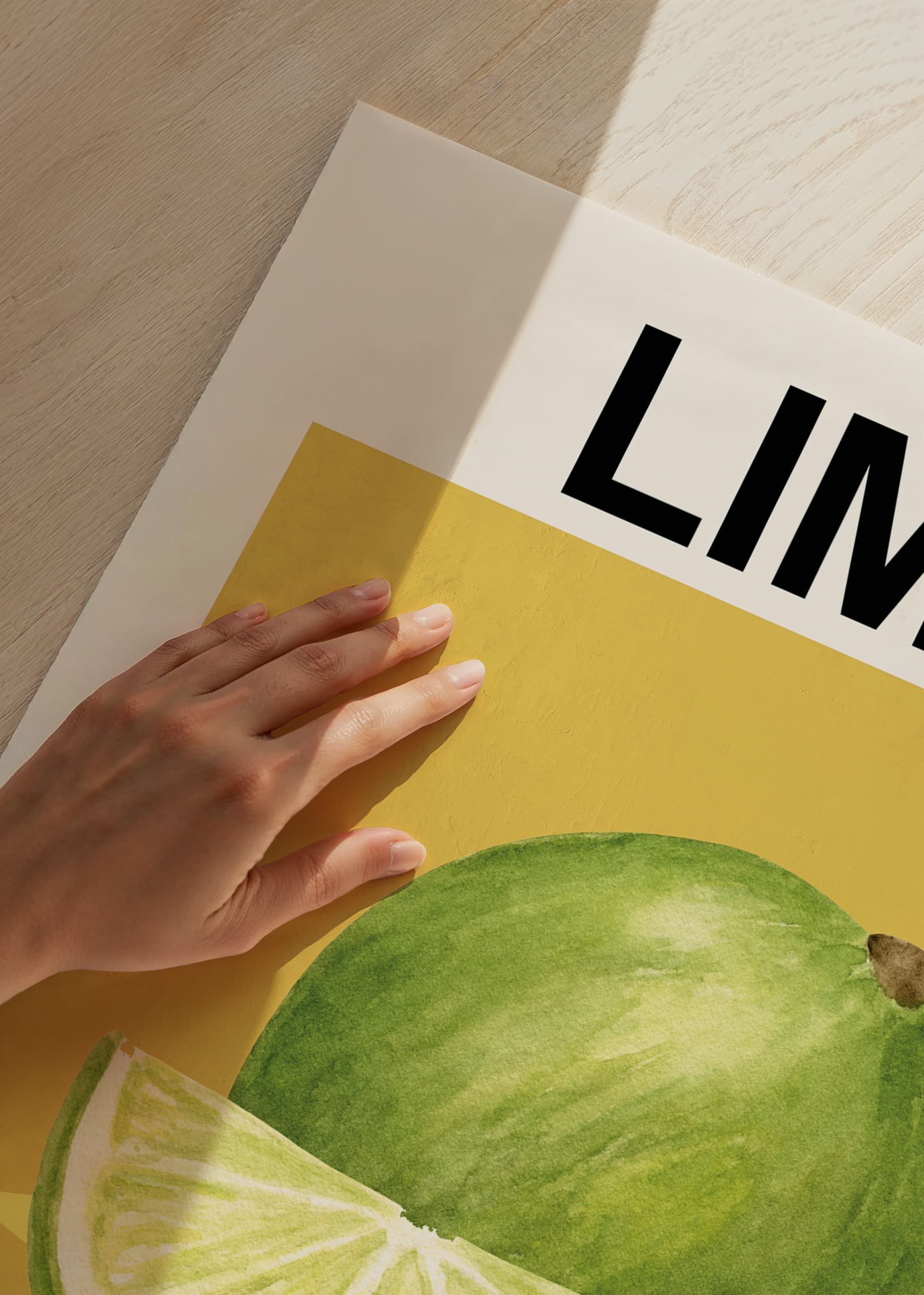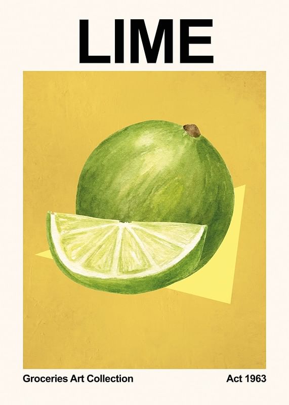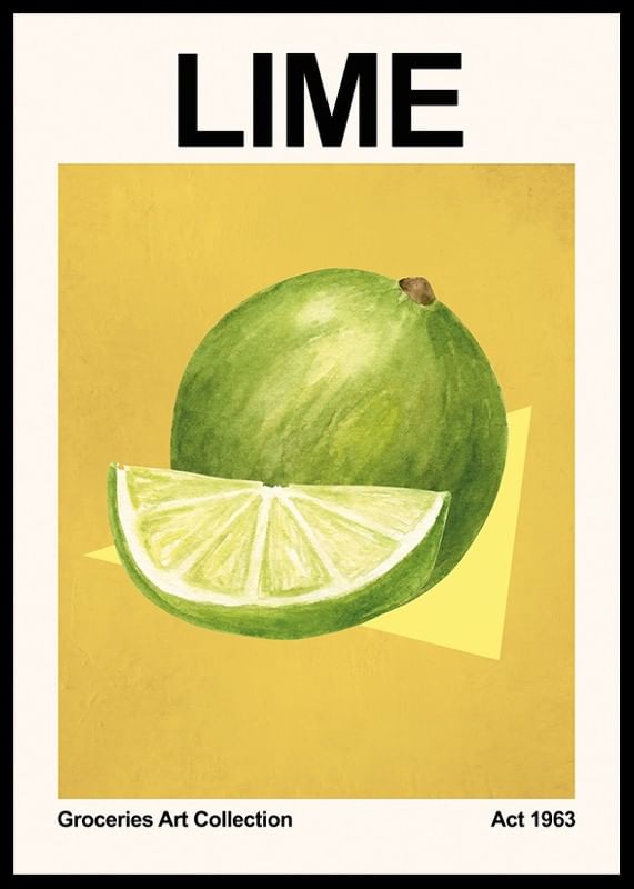 Het motief bestaat uit een hele limoen en een limoenpartje, geïllustreerd in groentinten tegen een warme, gele achtergrond. De heldere tekst LIME bovenaan zorgt voor een retro-achtige uitstraling. De kleuren en vormgeving maken deze poster een fris element in de keuken of eetkamer, vooral voor liefhebbers van vintage en grafische stijl.
