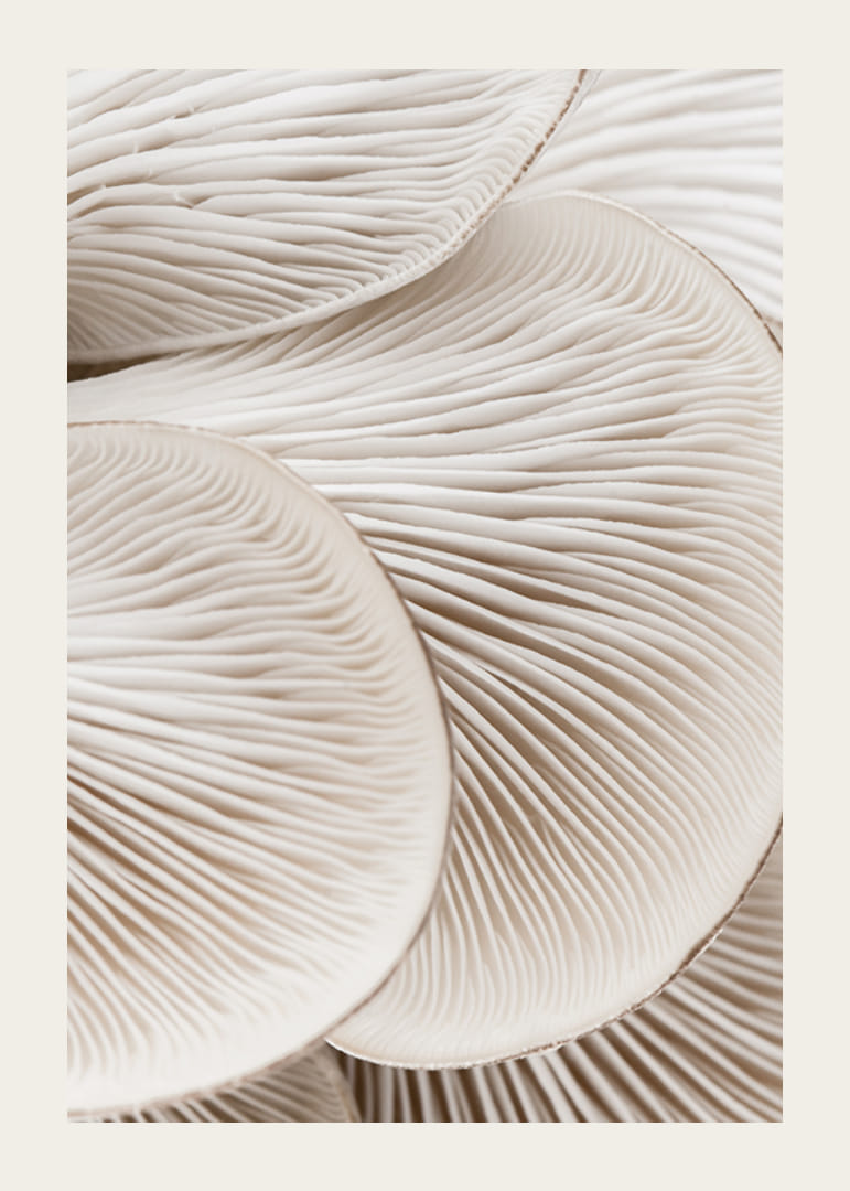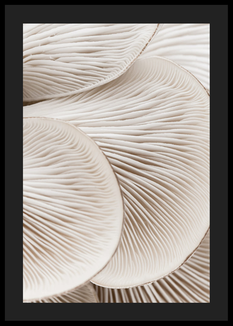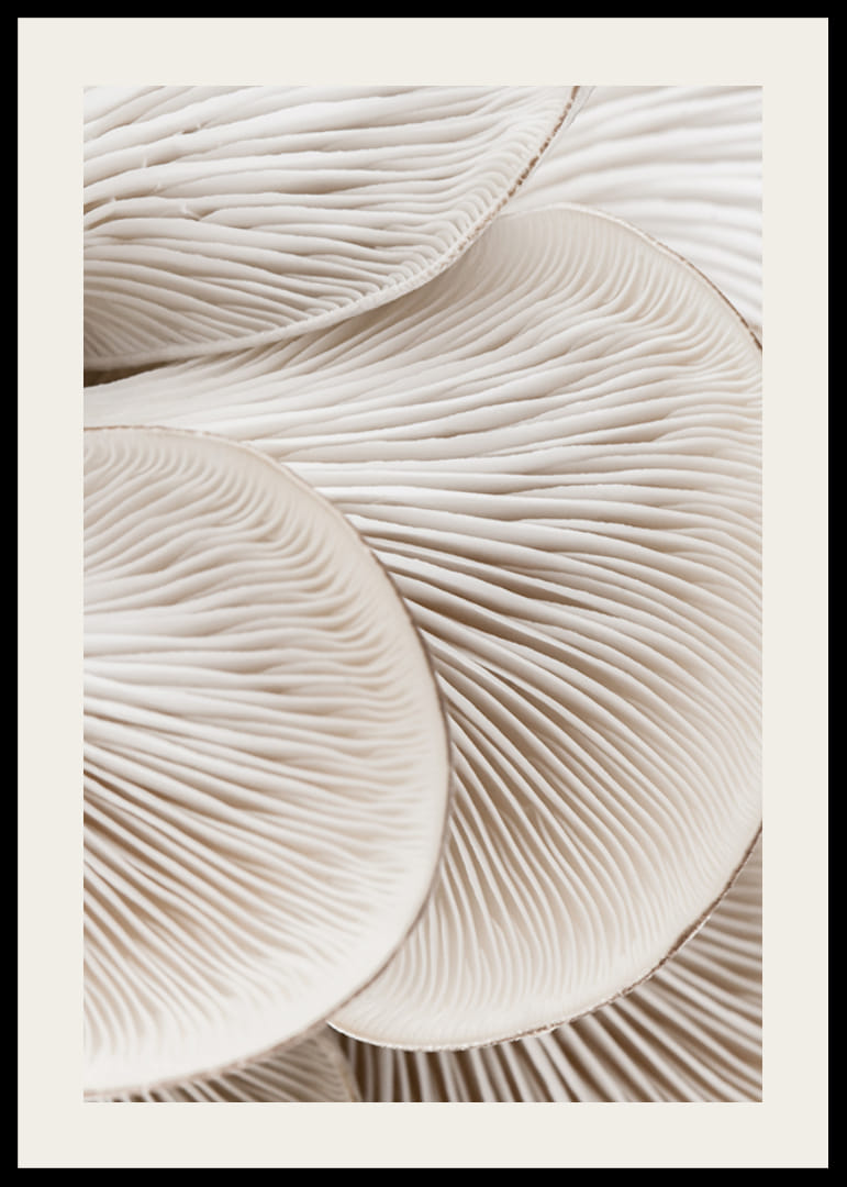 Close-up van witte paddenstoelhoedjes met heldere lamellen in organische vormen. De zachte, roomwitte tinten en het abstracte patroon geven een stijlvolle indruk. Deze poster past mooi in de keuken of eetkamer en vormt een interessante blikvanger, terwijl hij tegelijkertijd een rustige en natuurlijke sfeer aan de kamer toevoegt.