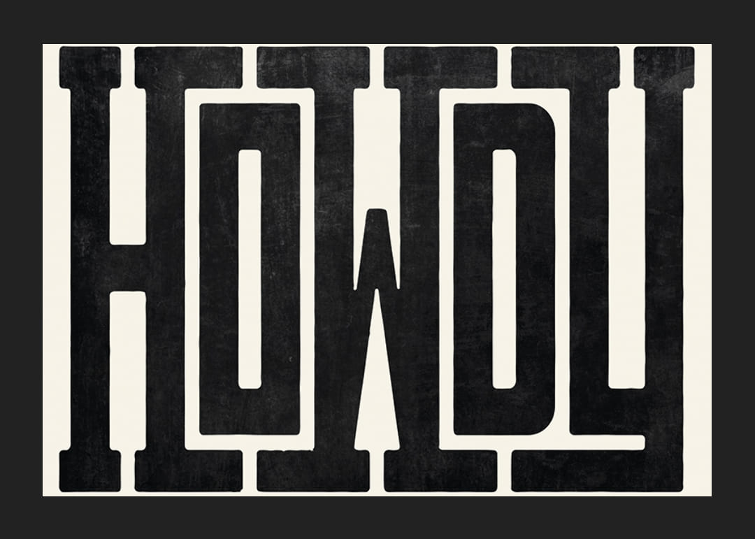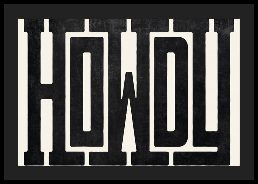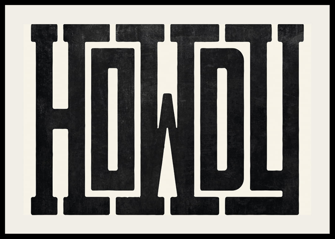 Grote, zwarte letters vormen het woord "Howdy" in een robuust en uitgesproken westers geïnspireerd lettertype tegen een lichte, zandkleurige achtergrond. De textuur van de letters geeft een handgedrukte uitstraling die visueel karakter creëert. Als poster vormt het motief een stijlvol en speels element in zowel de woonkamer als de hal.
